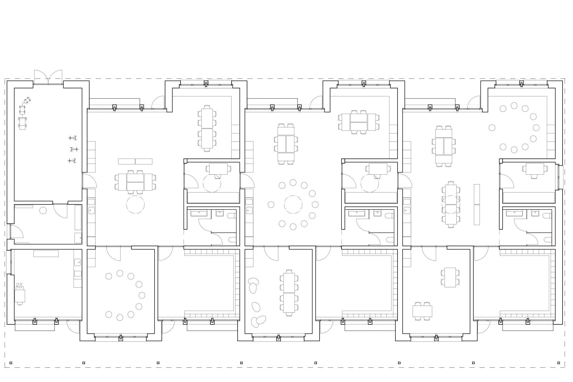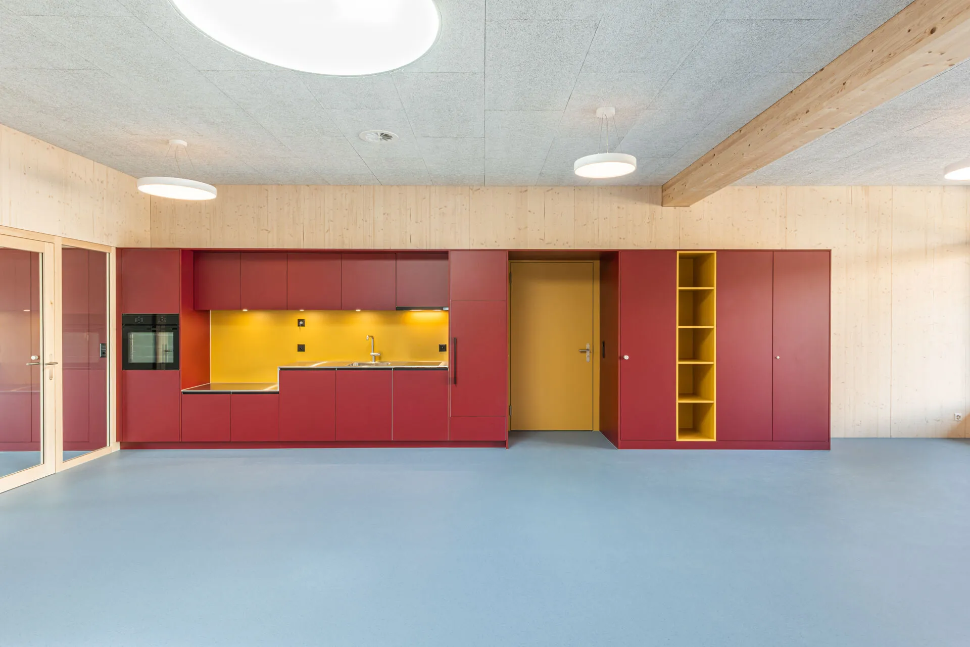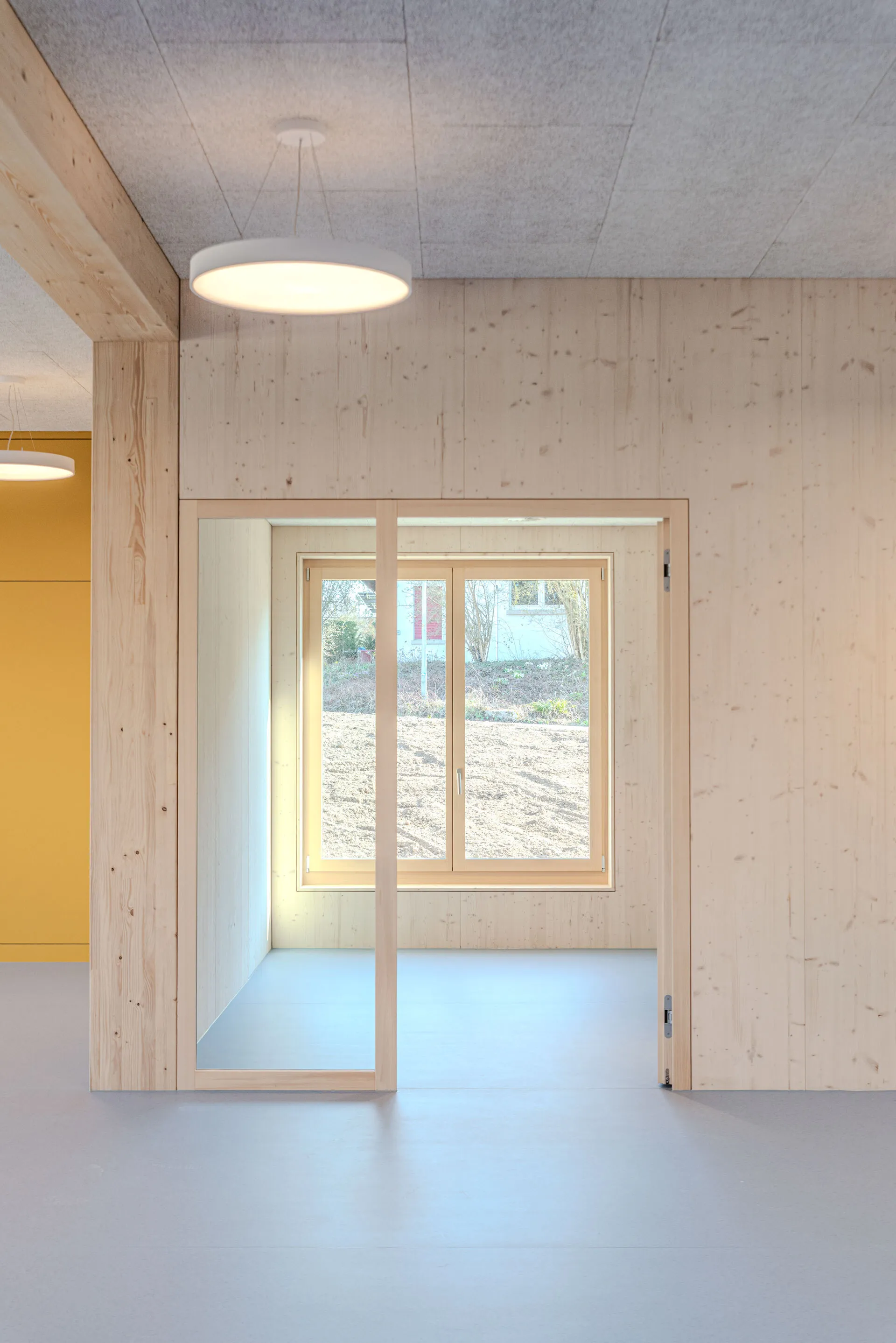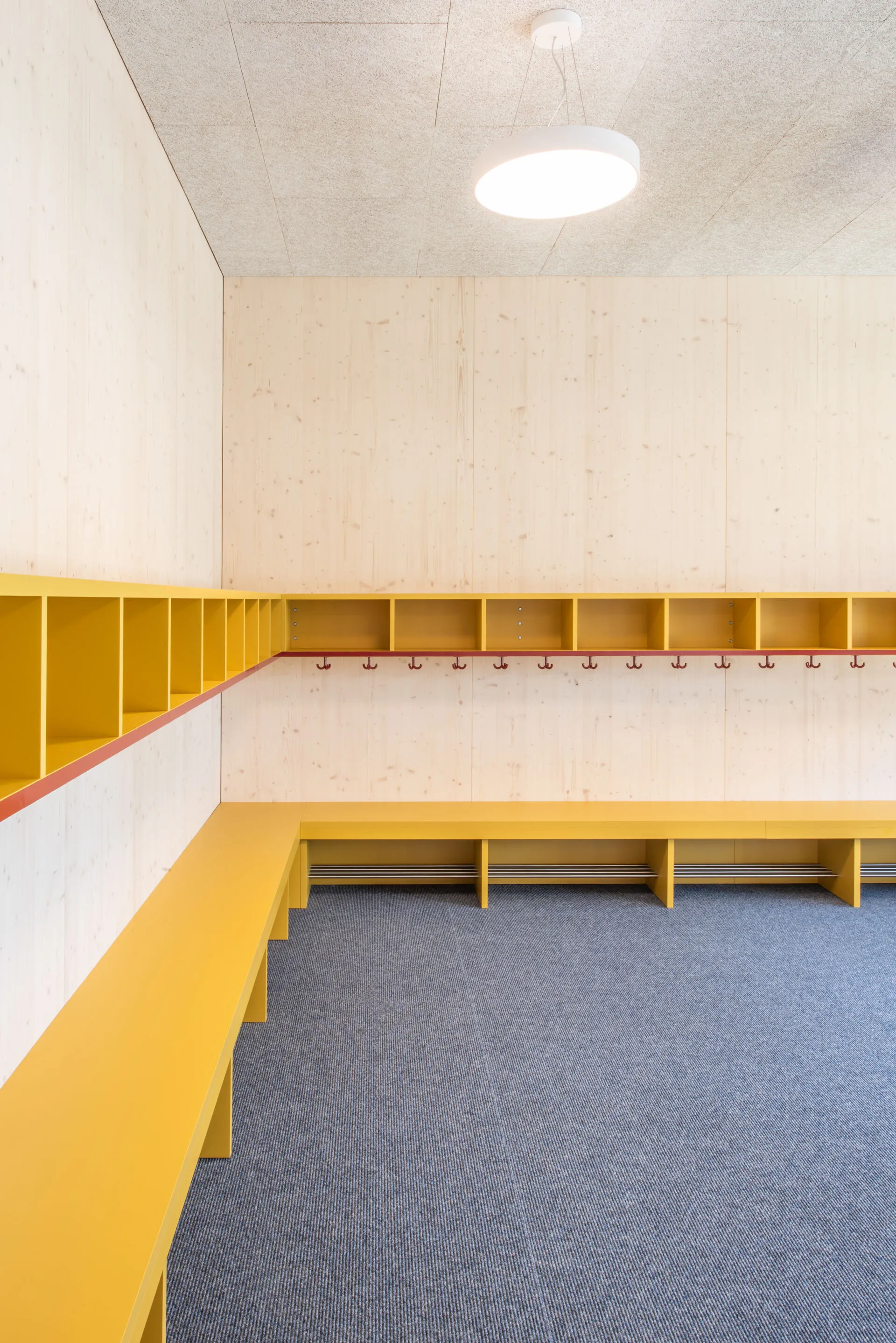 Eine rückwärtige Raumschicht bündelt die zudienenden Funktionen wie Technik-, Neben- und Lehrerbereiche und sorgt für eine klare, funktionale Organisation. Der Hauptraum ist durch eine leichte Zonierung gegliedert und ermöglicht vielfältige Nutzungen für Unterricht, Spiel und Rückzug.