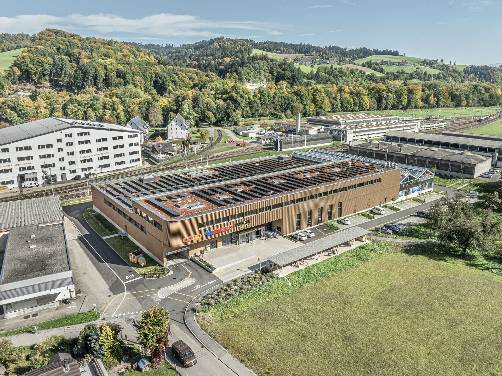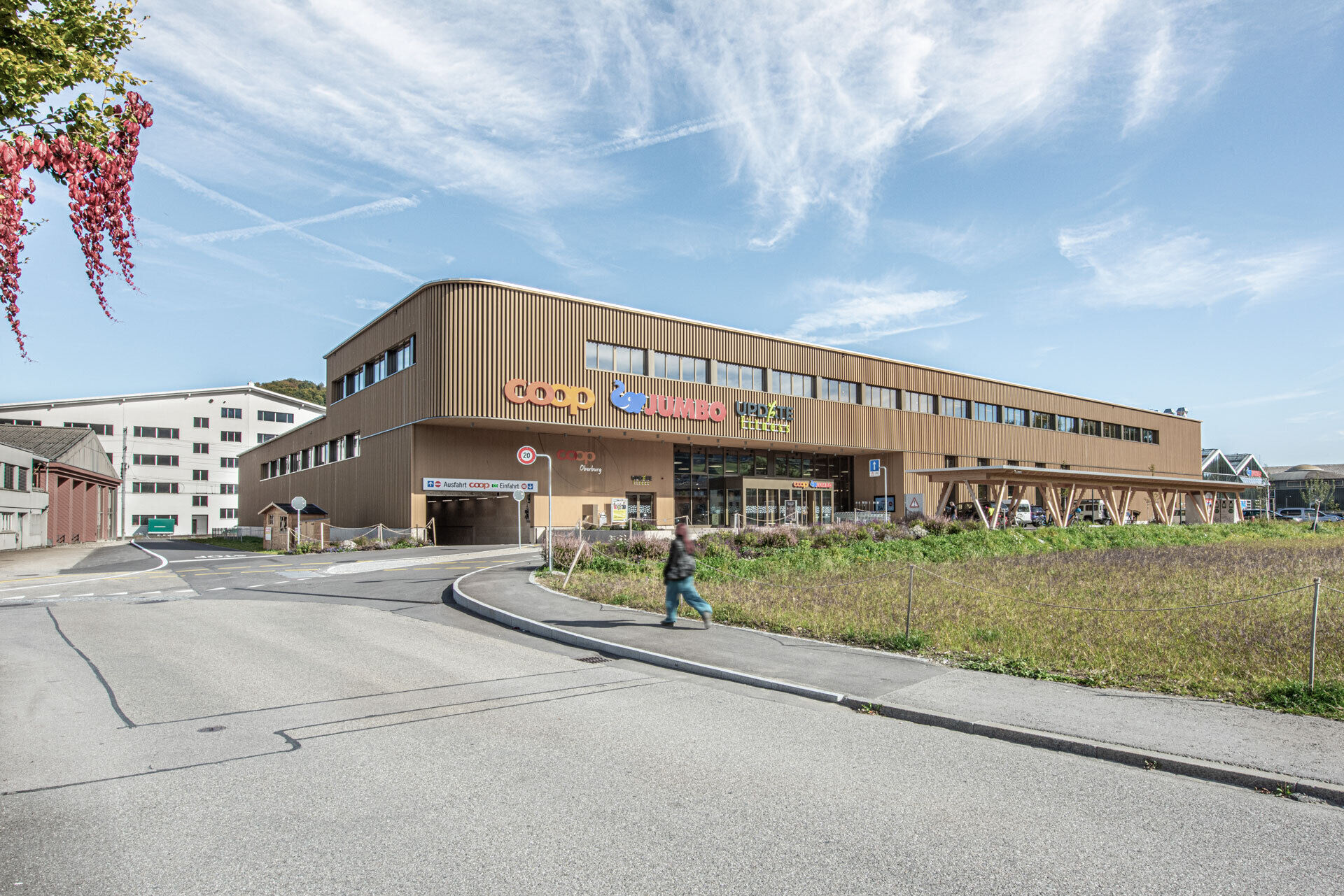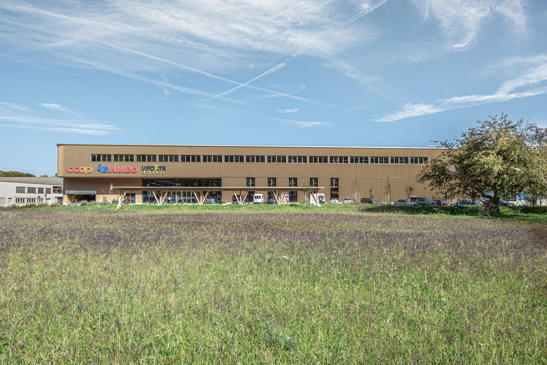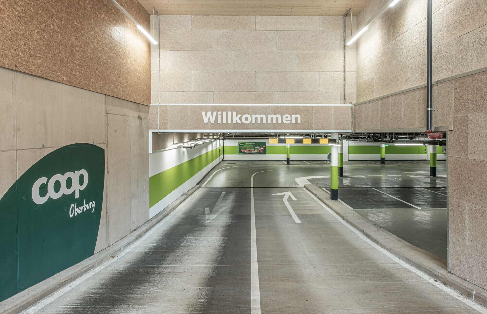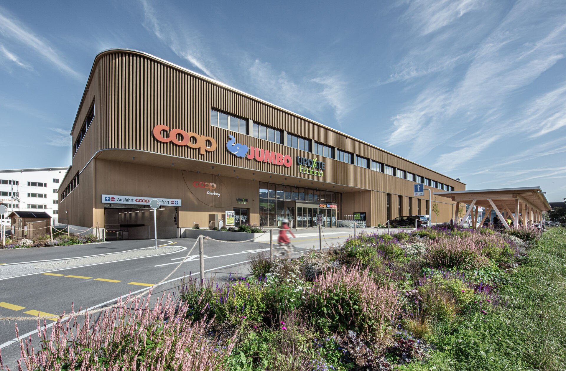 Der Ersatzneubau Coop Oberburg in Burgdorf wird als Kombiformat mit Supermarkt und Baumarkt erstellt. Das Gebäude besteht aus einem Holzrahmenbau mit aussteifenden Betonkernen. Im angrenzenden Glashaus werden der gedeckte Aussenverkauf sowie zwei Gewächshäuser organisiert.