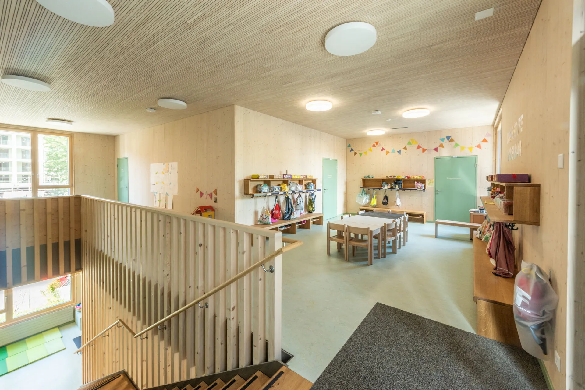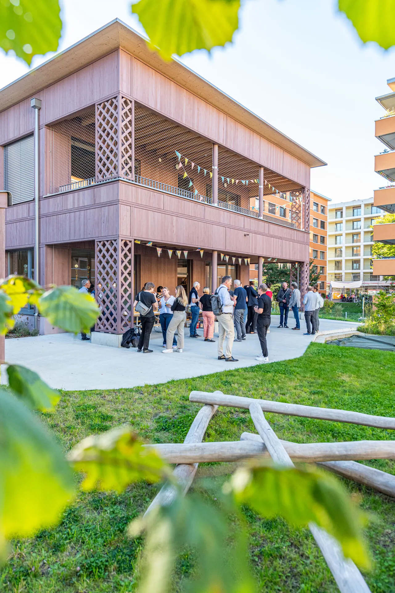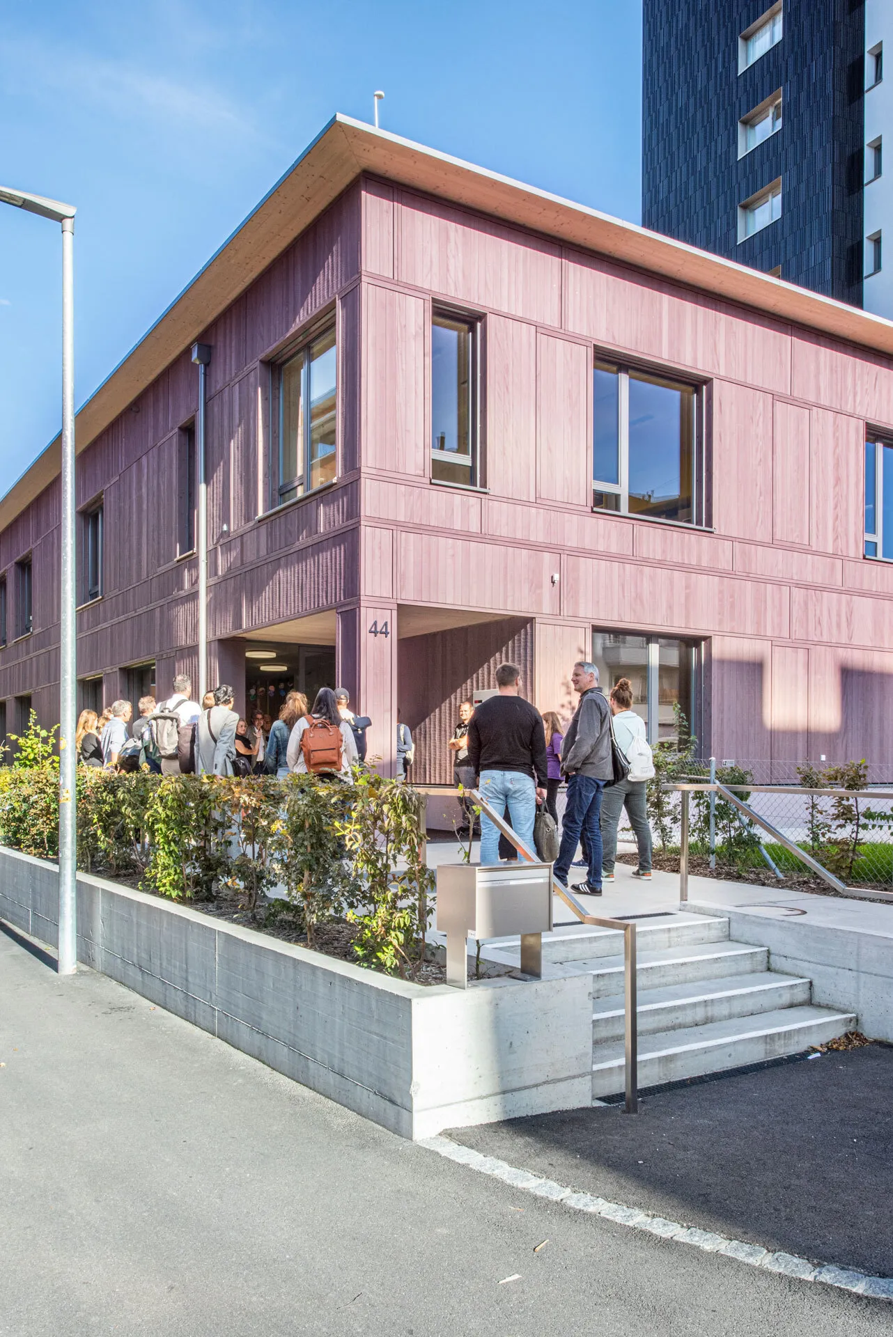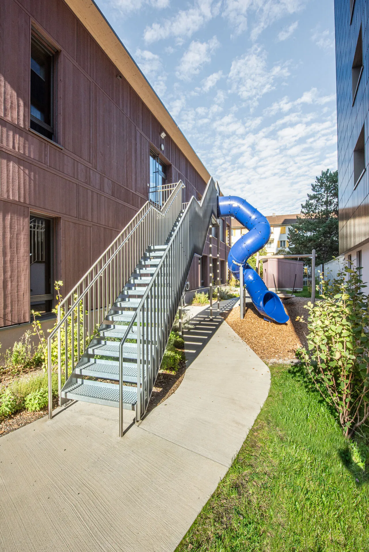 Die Fichtenholzfassade mit geschlossener vertikaler Schalung in Nut und Kamm wird durch unterschiedliche Felder strukturiert. Ihre Oberfläche wird in einem Rot-Ton behandelt. Die Ecken der gedeckten Aussenräume werden mit Holz-Rauten-Gittern ausgezeichnet. Im Bereich der gedeckten Aussenräume werden Sitzbänke in die Fassade integriert. Eine aussenliegende Fluchttreppe mit Rutsche verbindet den Garten mit dem Obergeschoss und stellt für Lehrkräfte und Kinder einen schnellen und attraktiven Zugang sicher.