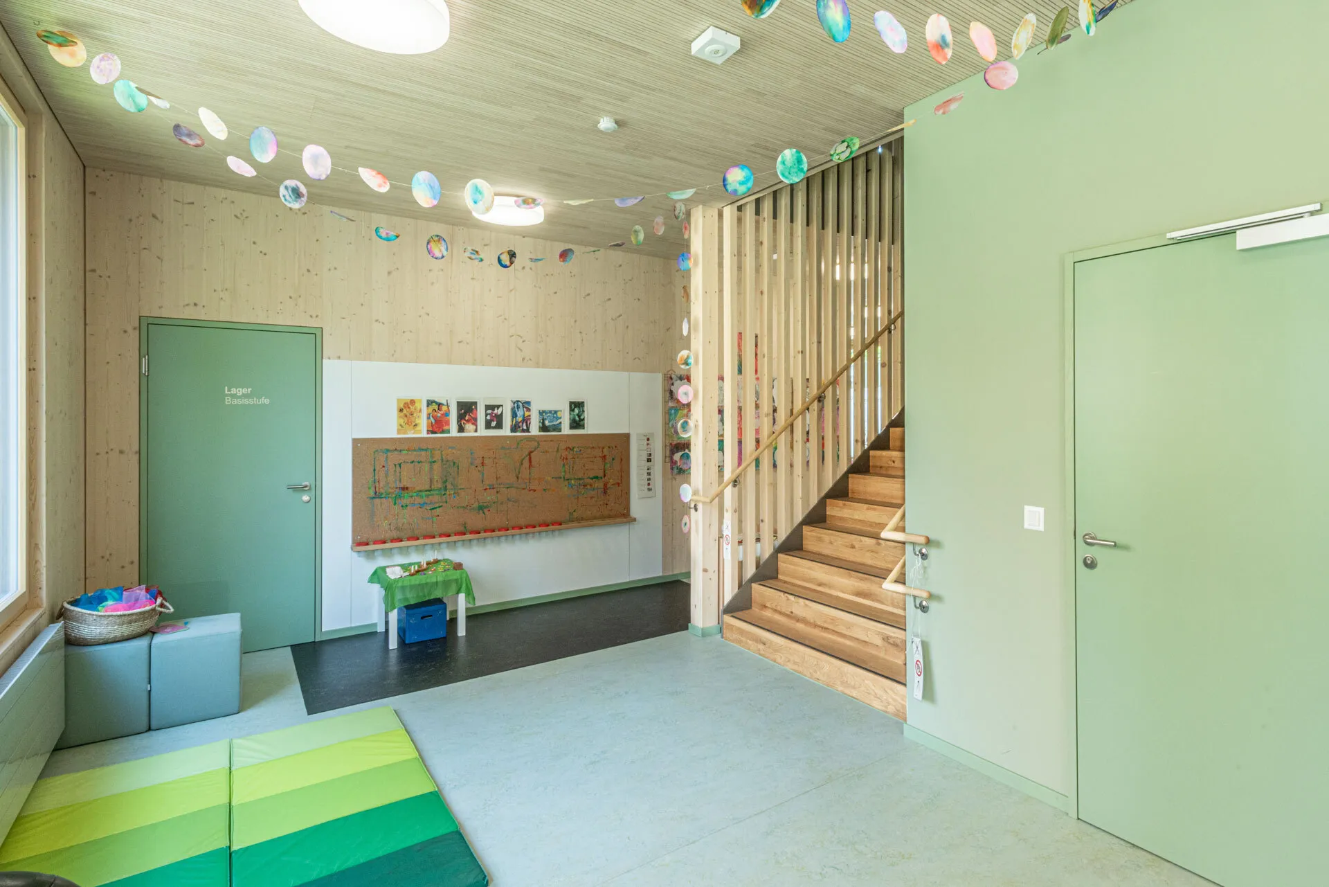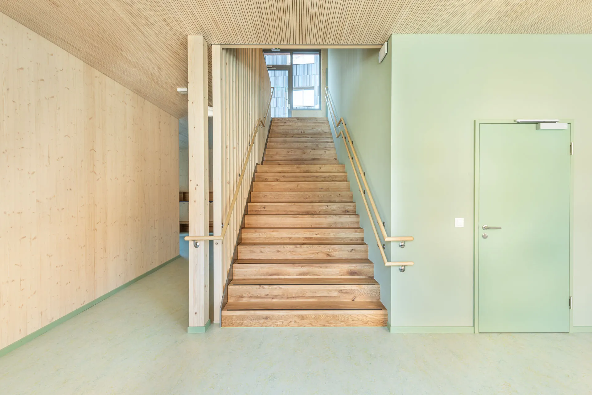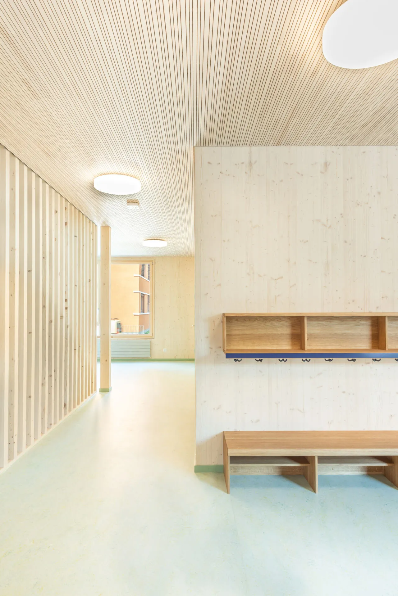 Die Fichtenholzfassade mit geschlossener vertikaler Schalung in Nut und Kamm wird durch unterschiedliche Felder strukturiert. Ihre Oberfläche wird in einem Rot-Ton behandelt. Die Ecken der gedeckten Aussenräume werden mit Holz-Rauten-Gittern ausgezeichnet. Im Bereich der gedeckten Aussenräume werden Sitzbänke in die Fassade integriert. Eine aussenliegende Fluchttreppe mit Rutsche verbindet den Garten mit dem Obergeschoss und stellt für Lehrkräfte und Kinder einen schnellen und attraktiven Zugang sicher.