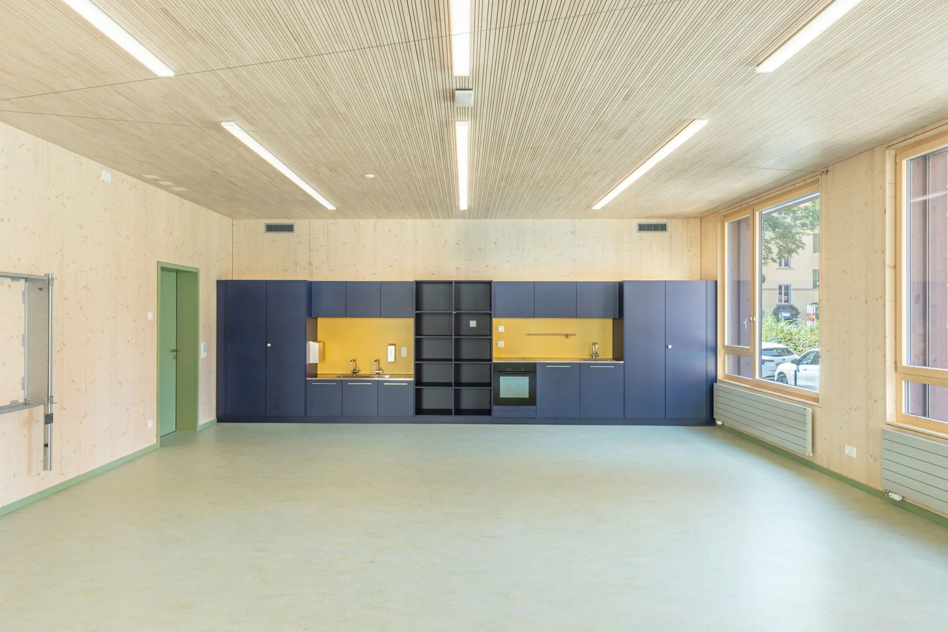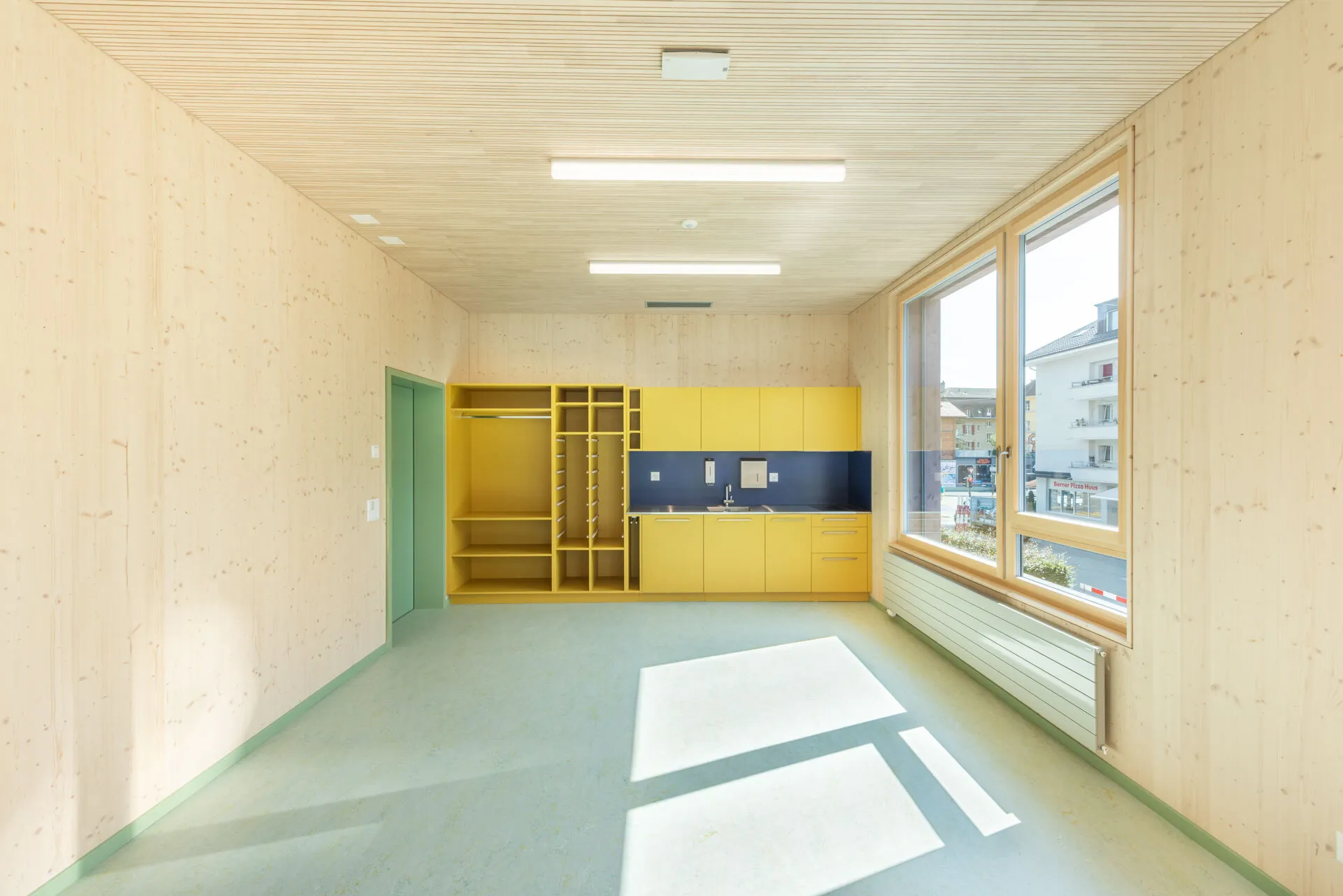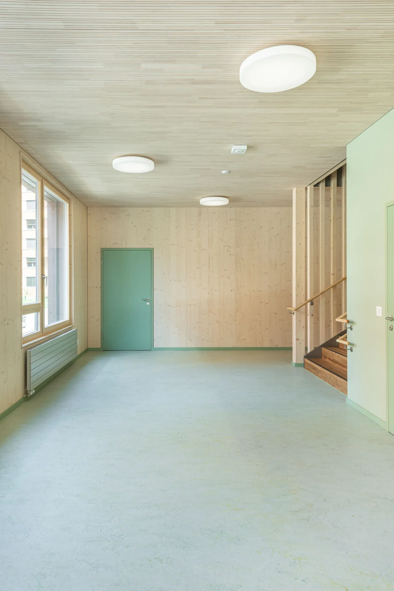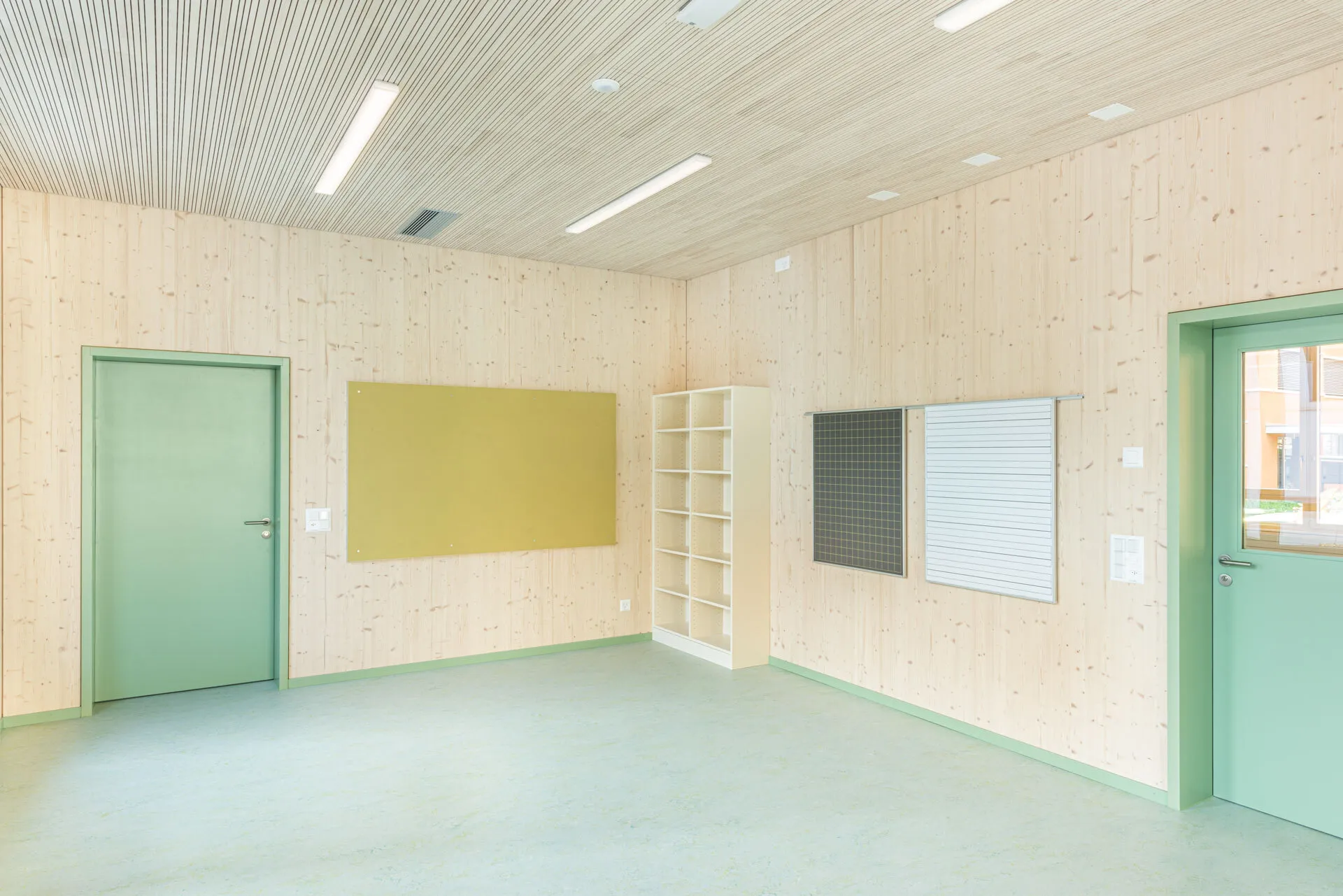 Die Fichtenholzfassade mit geschlossener vertikaler Schalung in Nut und Kamm wird durch unterschiedliche Felder strukturiert. Ihre Oberfläche wird in einem Rot-Ton behandelt. Die Ecken der gedeckten Aussenräume werden mit Holz-Rauten-Gittern ausgezeichnet. Im Bereich der gedeckten Aussenräume werden Sitzbänke in die Fassade integriert. Eine aussenliegende Fluchttreppe mit Rutsche verbindet den Garten mit dem Obergeschoss und stellt für Lehrkräfte und Kinder einen schnellen und attraktiven Zugang sicher.