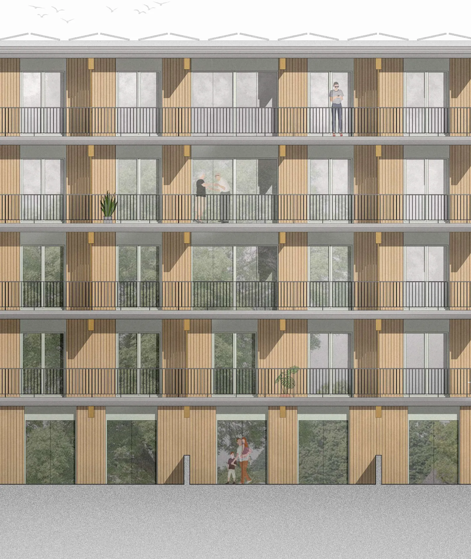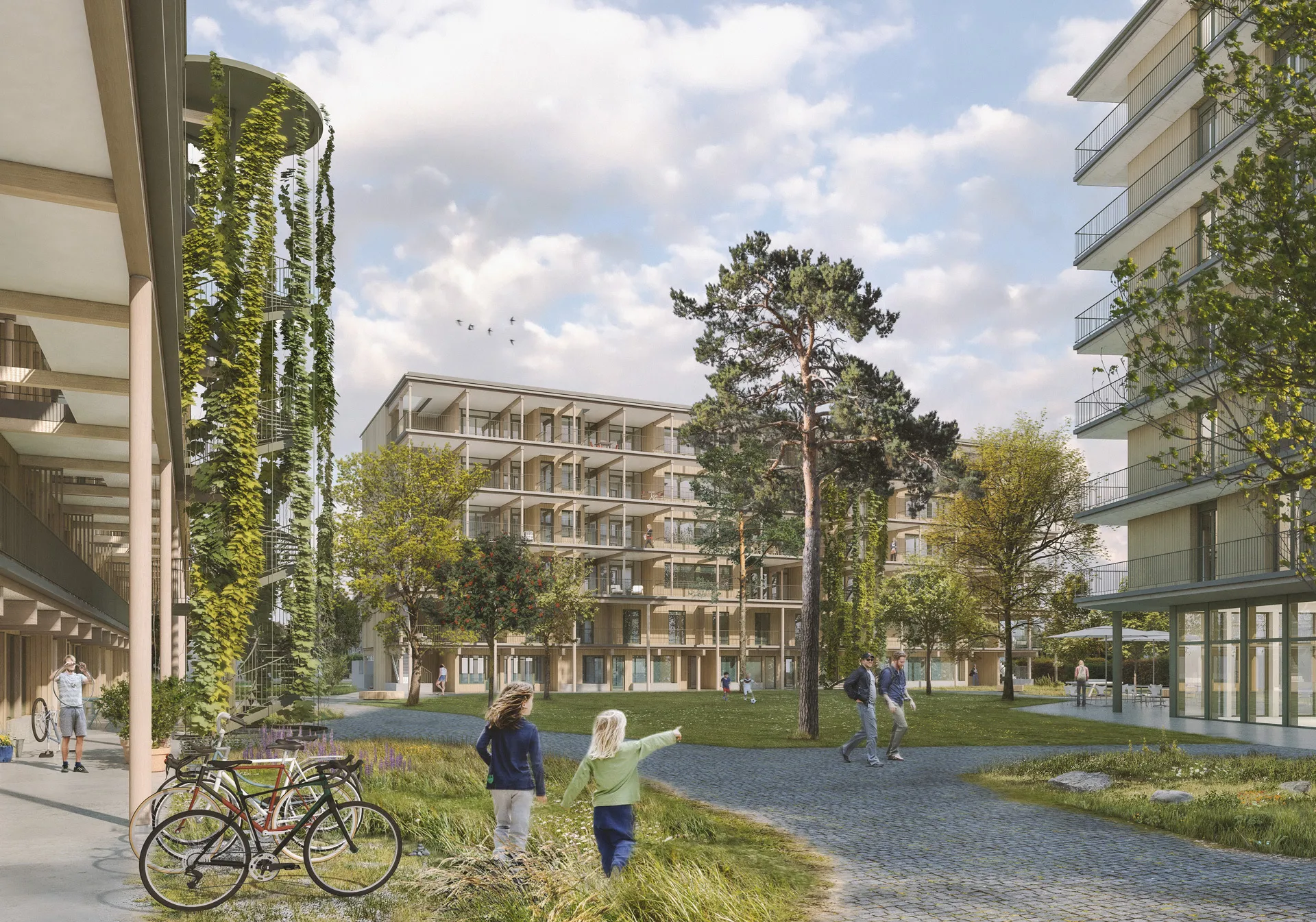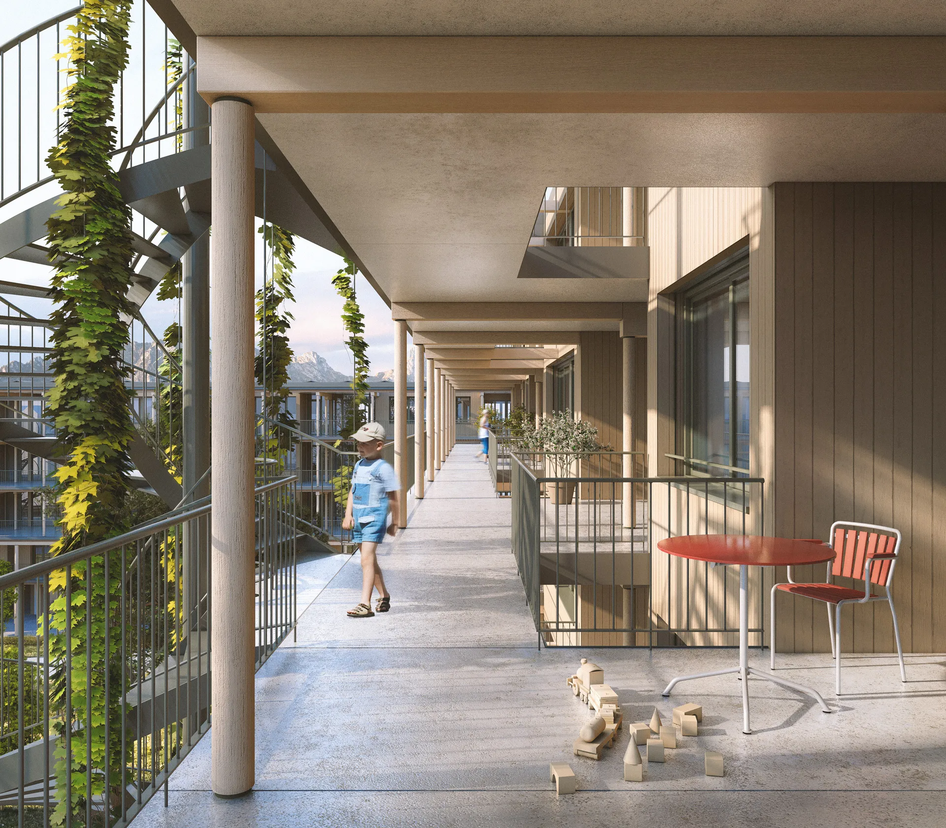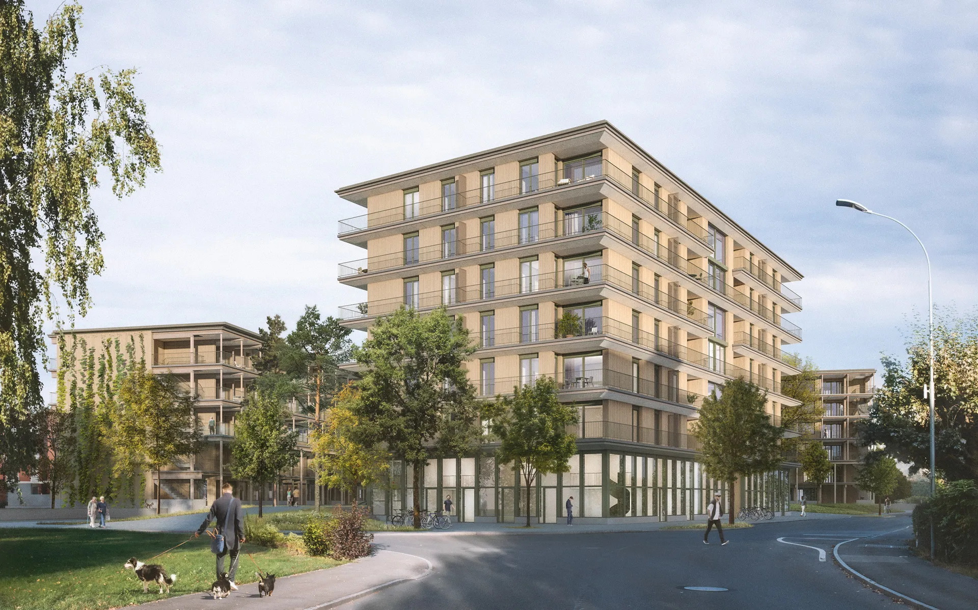 In den beiden linearen Baukörpern und dem punktförmigen Baukörper von unterschiedlicher Höhe und Geschosszahl wird ein breites wohntypologisches Spektrum an Wohnungen angeboten. Die beiden Längsbauten sind dem Durchwohnen über eine Laubengangerschliessung mit Aussenräume zu den Wohnungen gewidmet. Im Erdgeschoss befinden sich die grösseren Wohneinheiten als Duplex mit vorgelagerten privaten Gartenbereichen. Der punktförmige Baukörper beinhaltet im Erdgeschoss weitgehend die Nichtwohnnutzung mit Ateliers, Gemeinschaftsraum und kleingewerblichen Quartiernutzungen. In den Obergeschossen sind mehrheitliche kleinere Wohnungen über eine zentrale Erschliessung allseitig ausgerichtet.