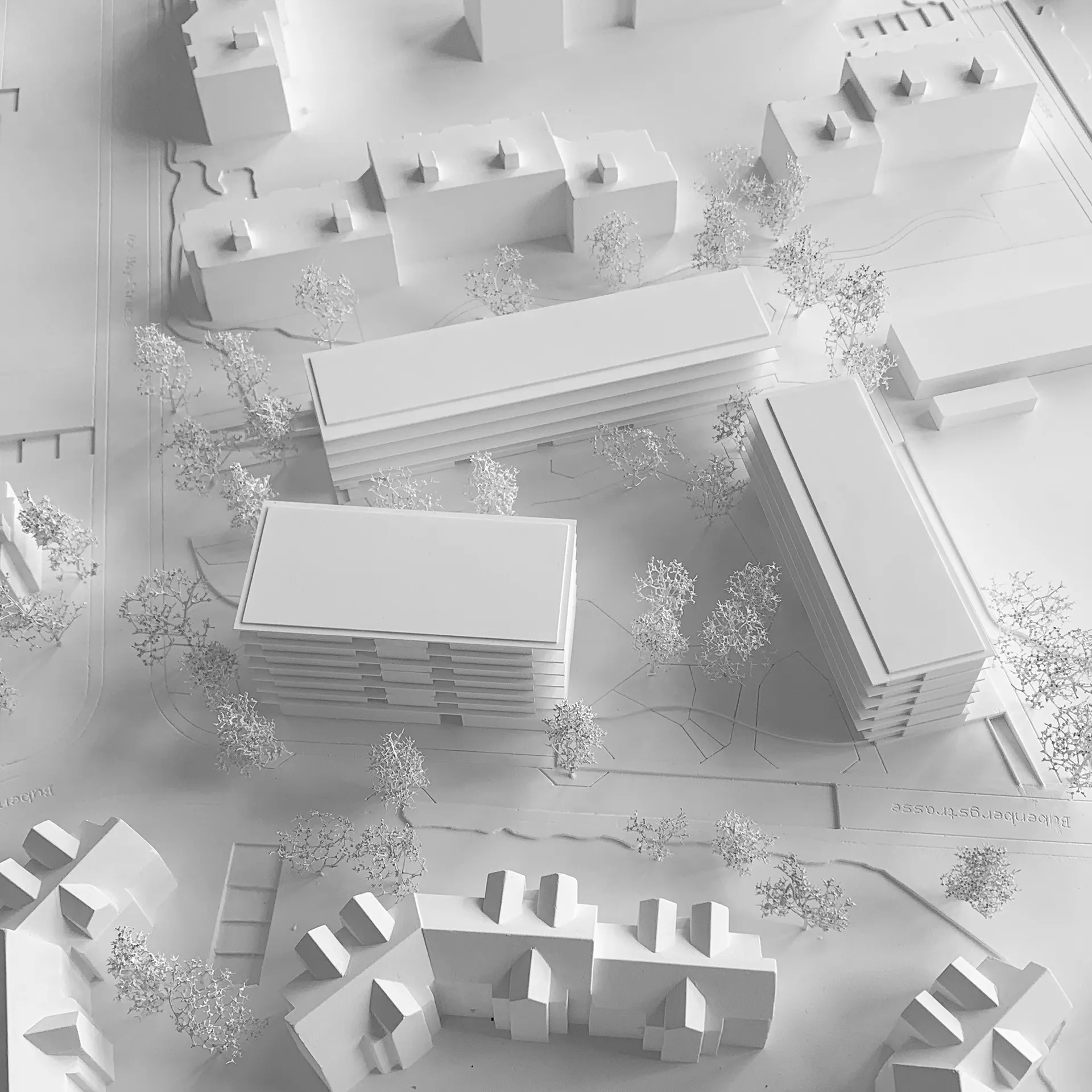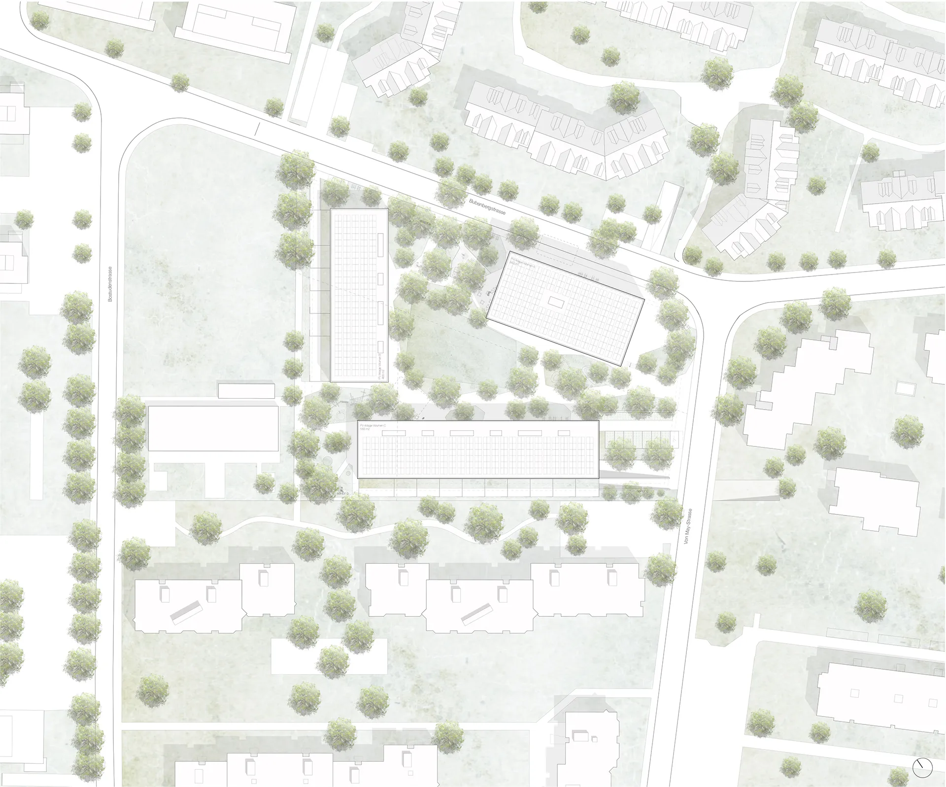 Am südlichen Siedlungsrand von Thun befindet sich das Quartier Bostuden mit dem Areal des Projektwettbewerbs. Das prägende und einfache Bebauungsprinzip mit drei neuen Baukörpern gewährleistet die Durchwegung und Erschliessung mit Adressierungen der Wohnbauten von Innen.