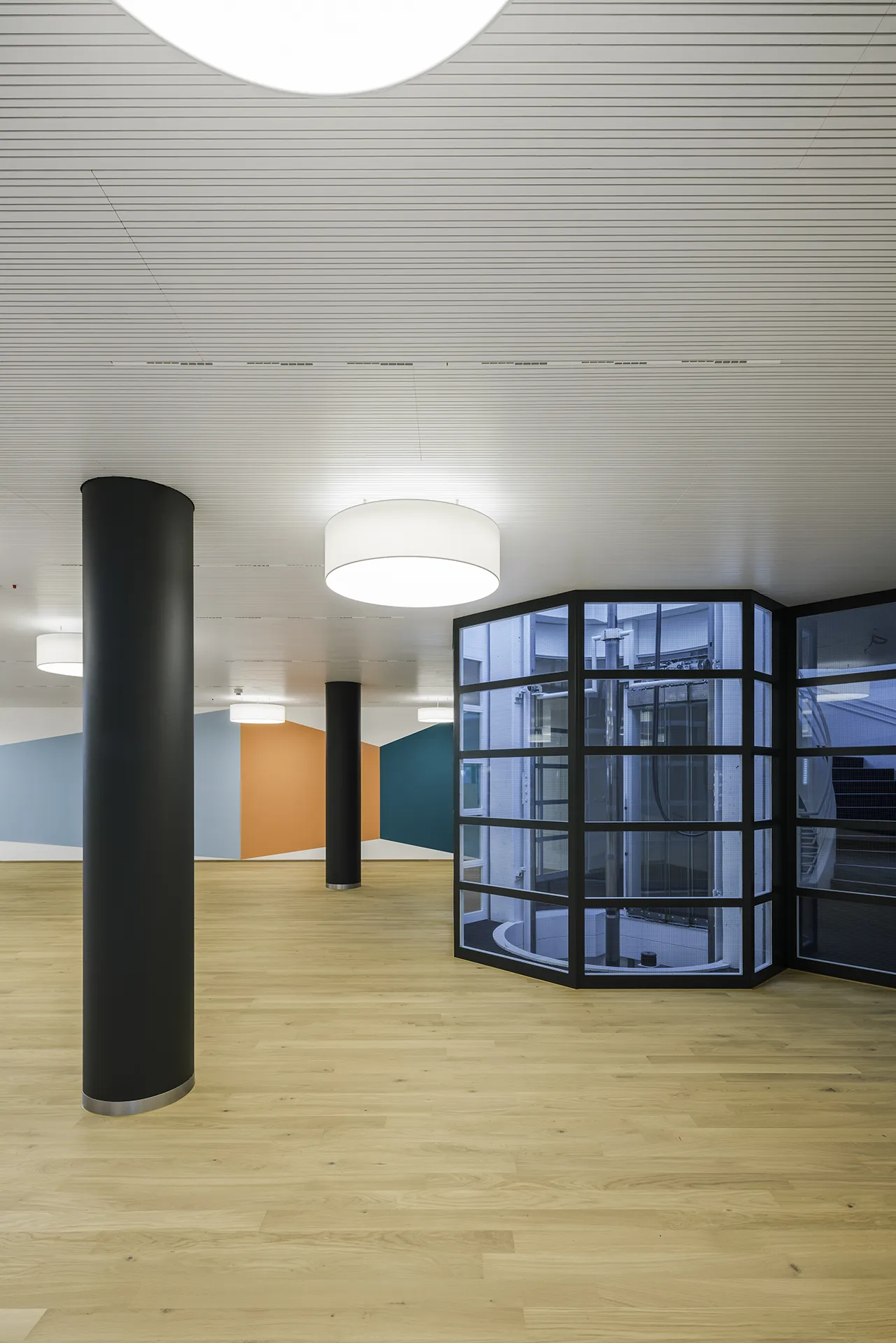 Der Bereich wird bereinigt und von Einbauten befreit. Boden-, Wand- und Deckenflächen werden einheitlich und zurückhaltend neugestaltet. Raumabschlüsse werden durch ein filigranes Glastrennwandsystem ersetzt. Durch die räumliche Klärung erhalten die Räume die Grosszügigkeit, die der Nutzung entspricht. Die Akustik wird verbessert und der Bereich wird mit LED-Beleuchtung und neuen Multimediasystemen ausgestattet.