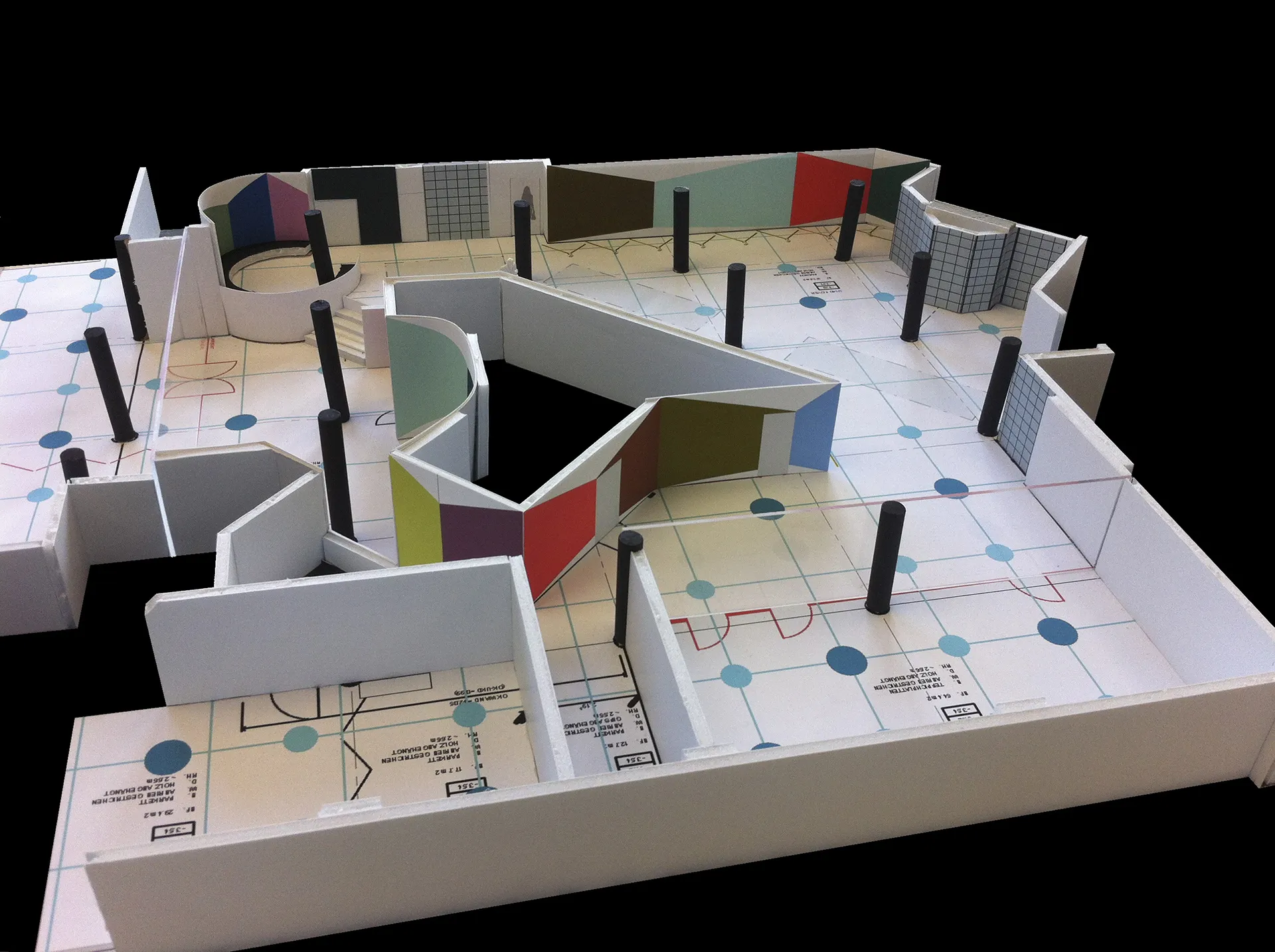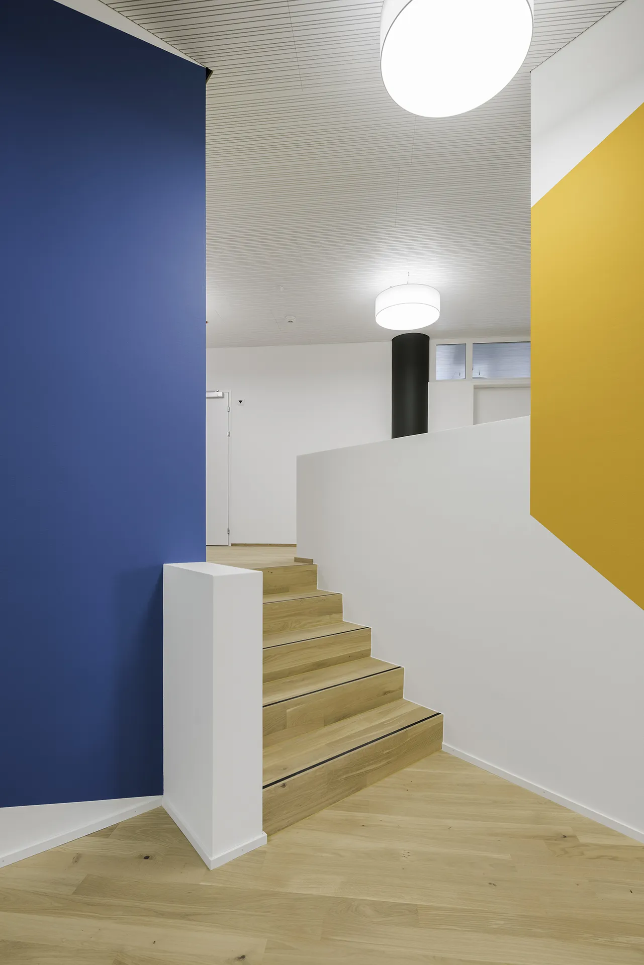 Die letzte und grösste Verwandlung erfährt das Foyer durch ein Kunstprojekt von Dominik Stauch. Die flächige, geometrische Wandmalerei in kräftigen Farben verfremdet durch ihre dynamisch-abstrakte Perspektive den Raum und gibt ihm eine neue Identität.