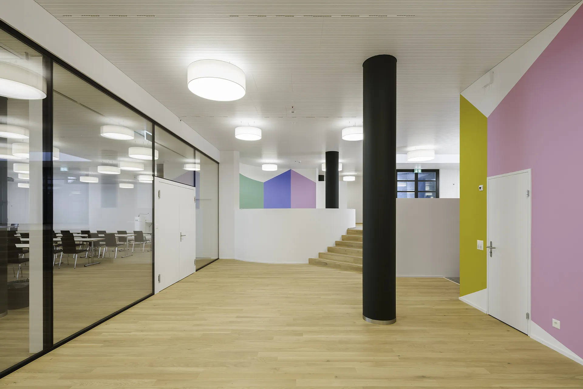 Im Untergeschoss des Bürogebäudes der GVB in Ittigen befinden sich Foyer, Saal und Sitzungszimmer für Veranstaltungen und Weiterbildungen. Die Zone wird durch Oblichter und einen Tiefhof mit Tageslicht versorgt. Insbesondere durch Einbauten und sehr unruhige Deckenuntersichten wirkt der Bereich unübersichtlich und wenig grosszügig. Die Räume sollen aufgewertet, die Oberflächen saniert und neugestaltet werden.