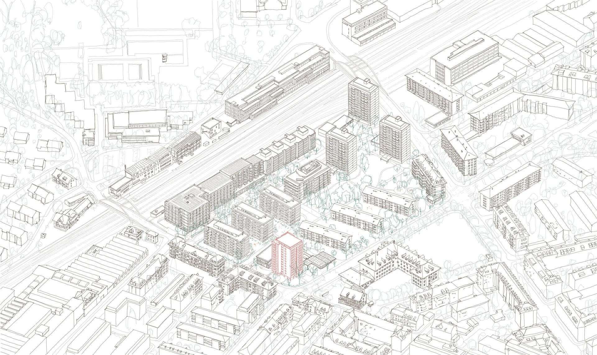 Die ursprüngliche Backsteinfassade wird mit einer hinterlüfteten Keramikfassade verkleidet; die zurückspringenden Fassadenbereiche erhalten eine Putzfassade. Die ursprüngliche Identität und der Ausdruck des Hochhauses werden gestärkt. Das Eingangsgeschoss, welches ursprünglich als Waschbereich diente, bietet nun eine Fläche zur Büronutzung.