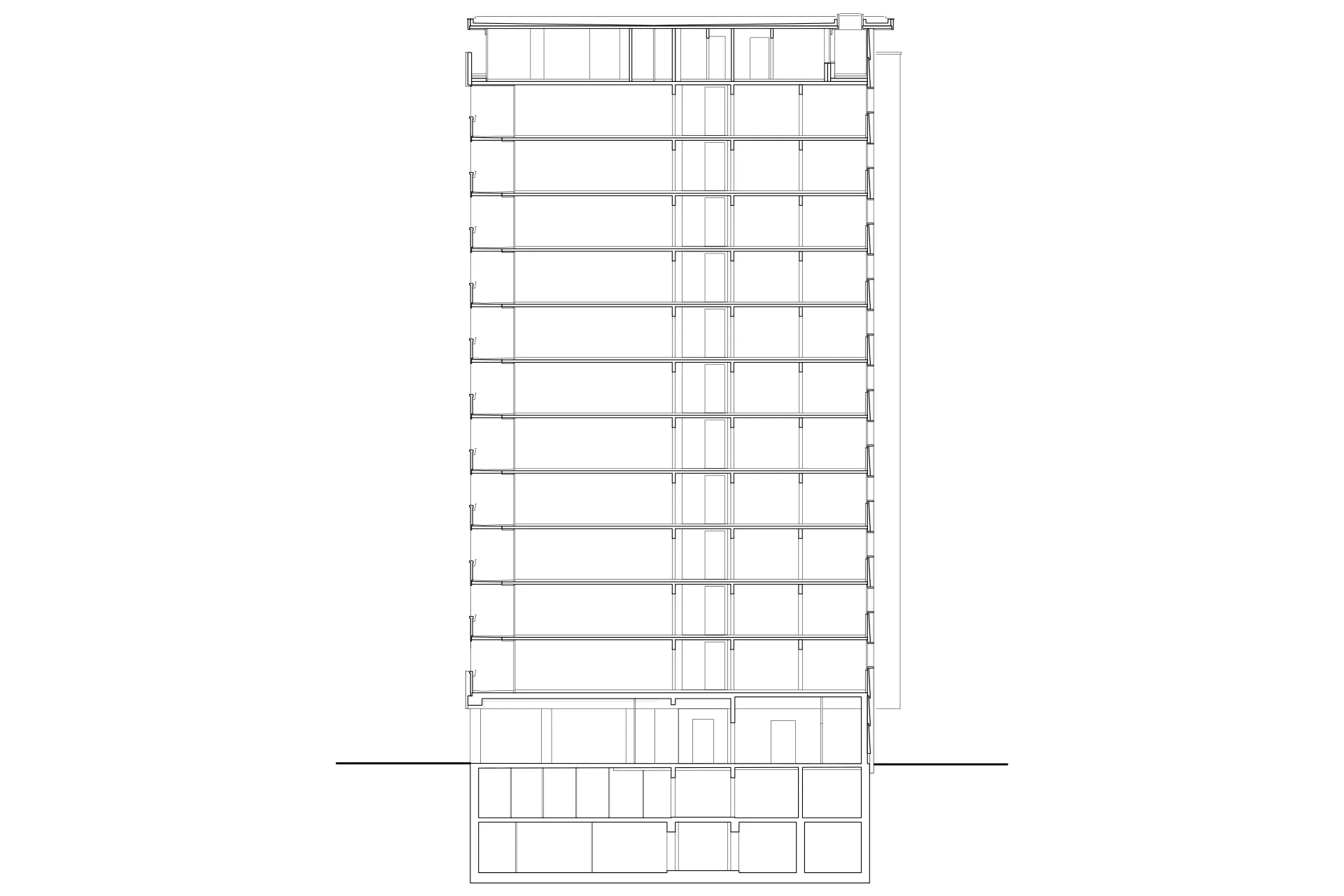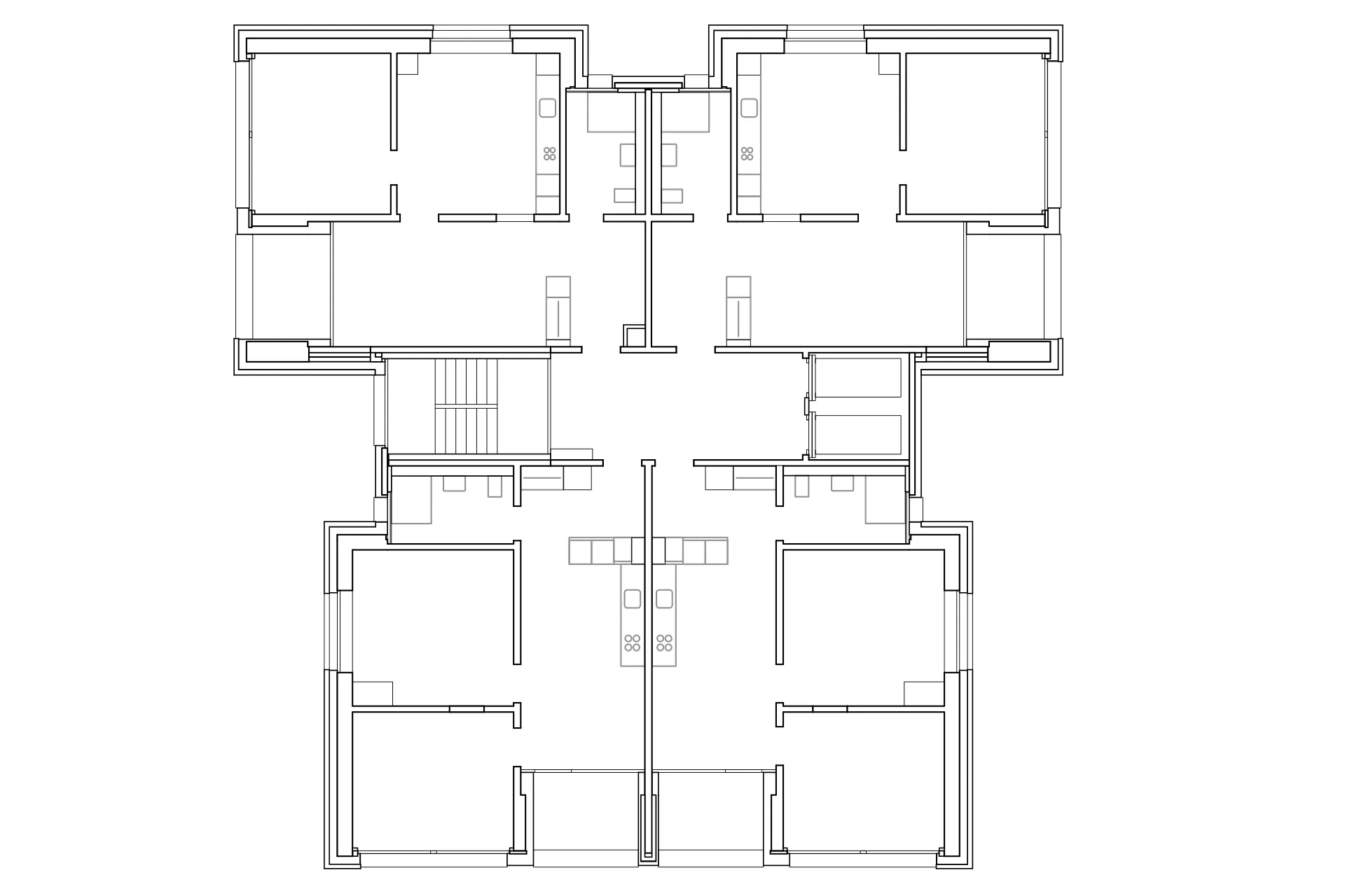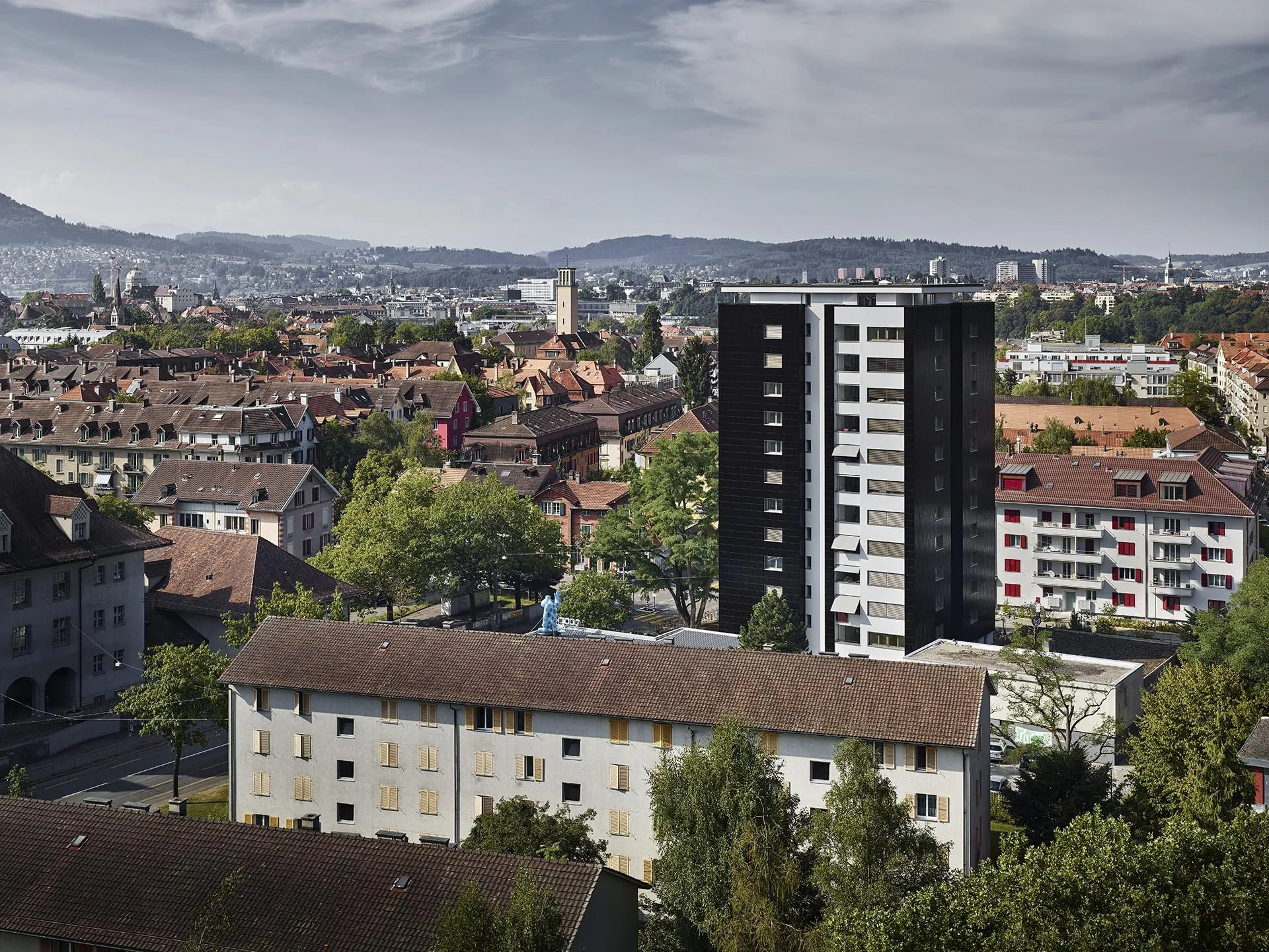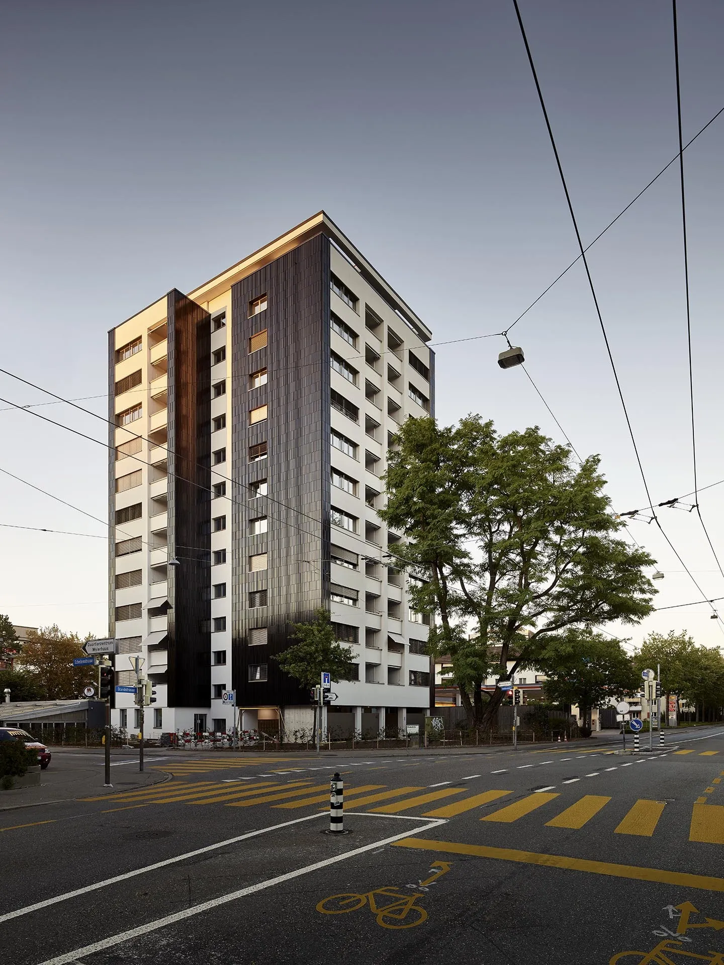 Die gewählte Grundrissform bietet Platz für vier Wohnungen pro Geschoss und eine 5 ½ Zimmerwohnung im Attika. Im Rahmen der Totalsanierung werden die bestehenden 3 ½ Zimmerwohnungen zu grosszügigen 2 ½ Zimmerwohnungen neuorganisiert. Neben der gesamten Neuinstallation der Haustechnik, der Erdbebenertüchtigung, dem Ersatz der Liftanlage und der unterirdischen Anbindung an die Einstellhalle wird die Gebäudehülle komplett saniert.