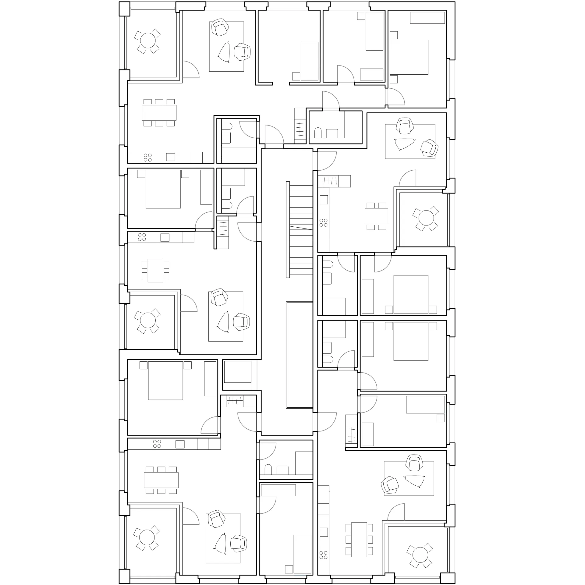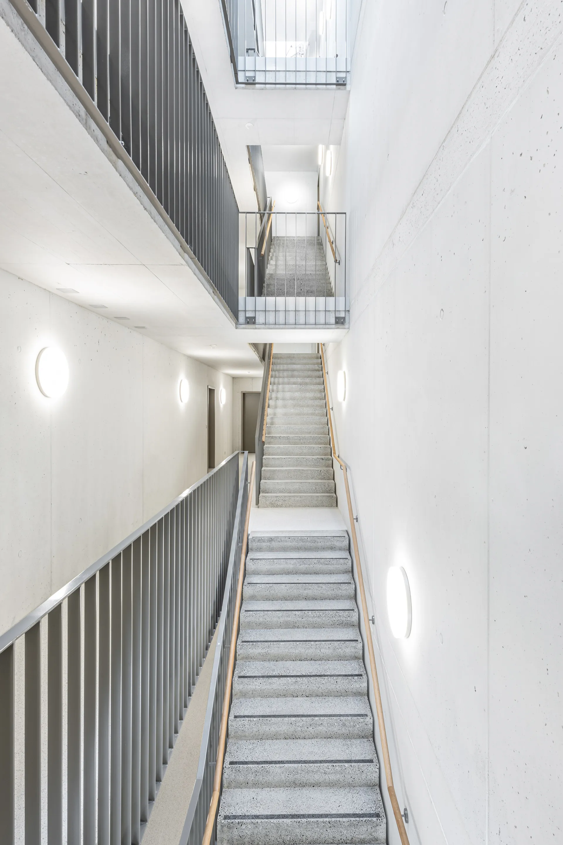 Das Gebäude orientiert sich zur Freiburgstrasse. Im Inneren werden die 19 Wohnungen über eine kaskadenförmige Treppenanlage erschlossen.