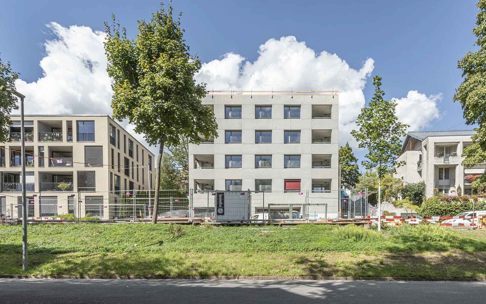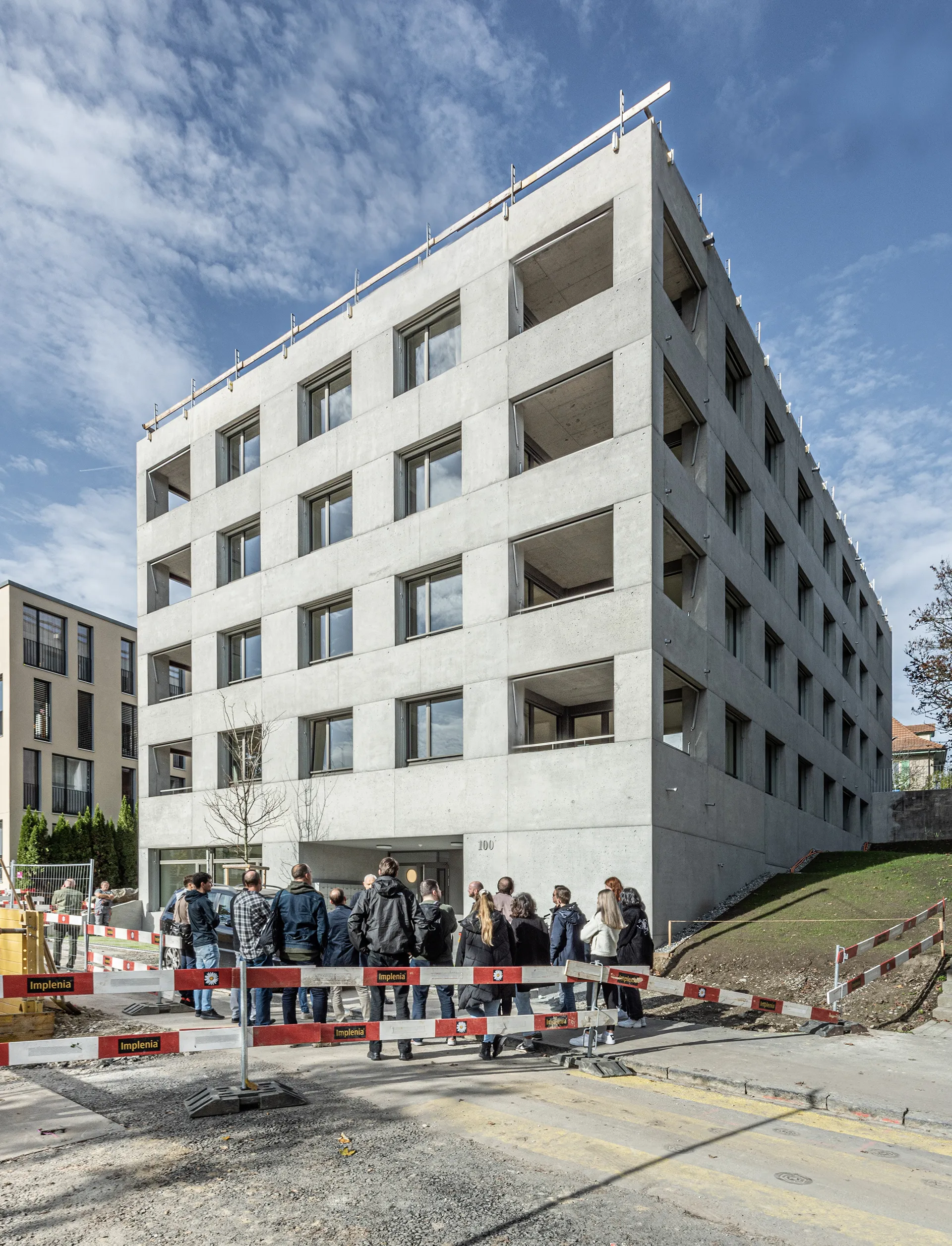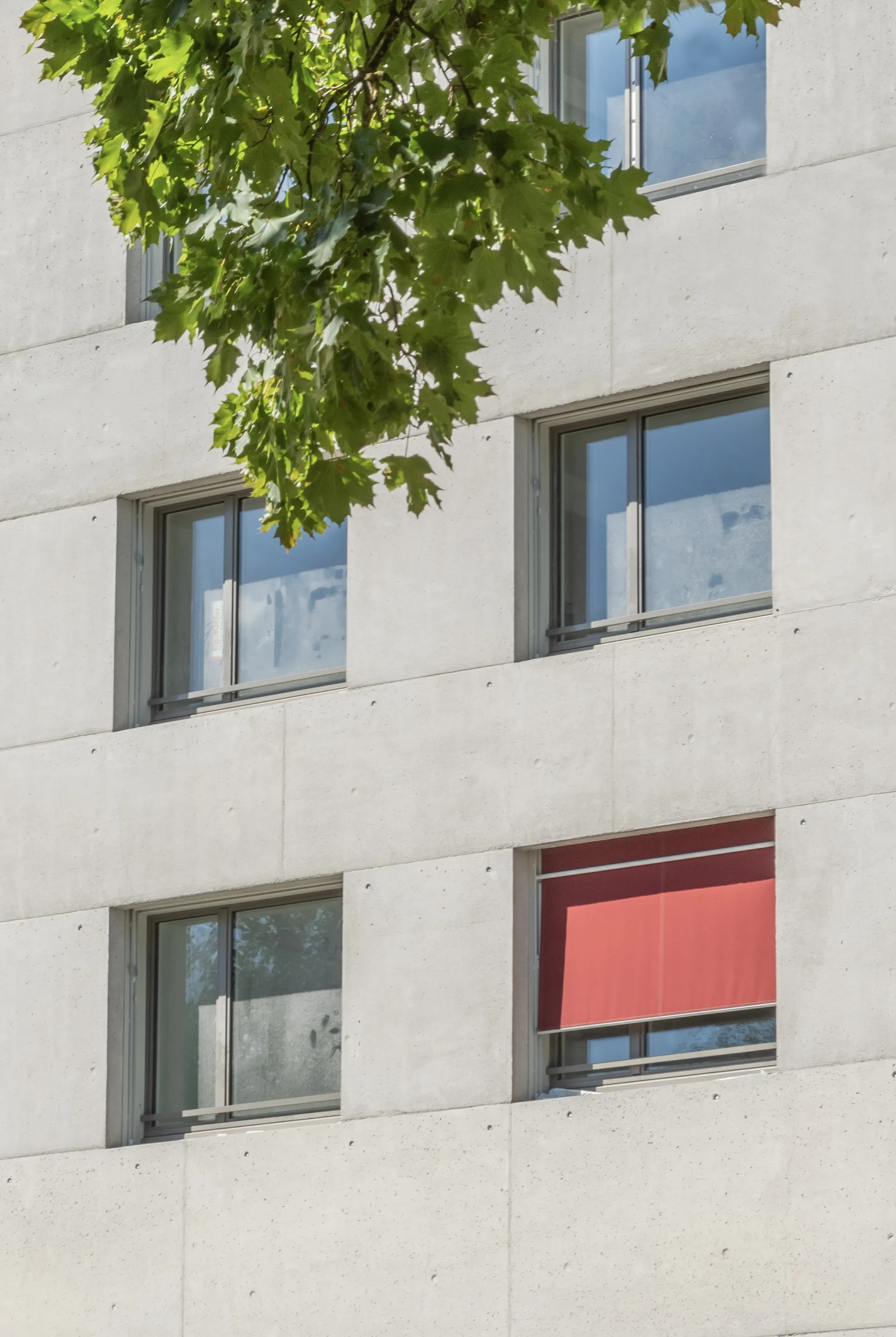 Die Fassaden in sandgestrahltem Sichtbeton geben dem Baukörper die nötige Präsenz im städtischen Raum. Das Mehrfamilienhaus zeichnet sich durch die Tiefenwirkung der Fassade und eine sorgfältige, qualitätsvolle Materialisierung aus. Die eingezogenen Loggien werden als Teil des Kubus gelesen und unterstützen die monolithische Wirkung des Körpers. Die Stoffstoren an den Fenstern und Loggien ragen bewusst über den Gebäudeumriss des Kubus heraus und setzten einen Farbakzent.