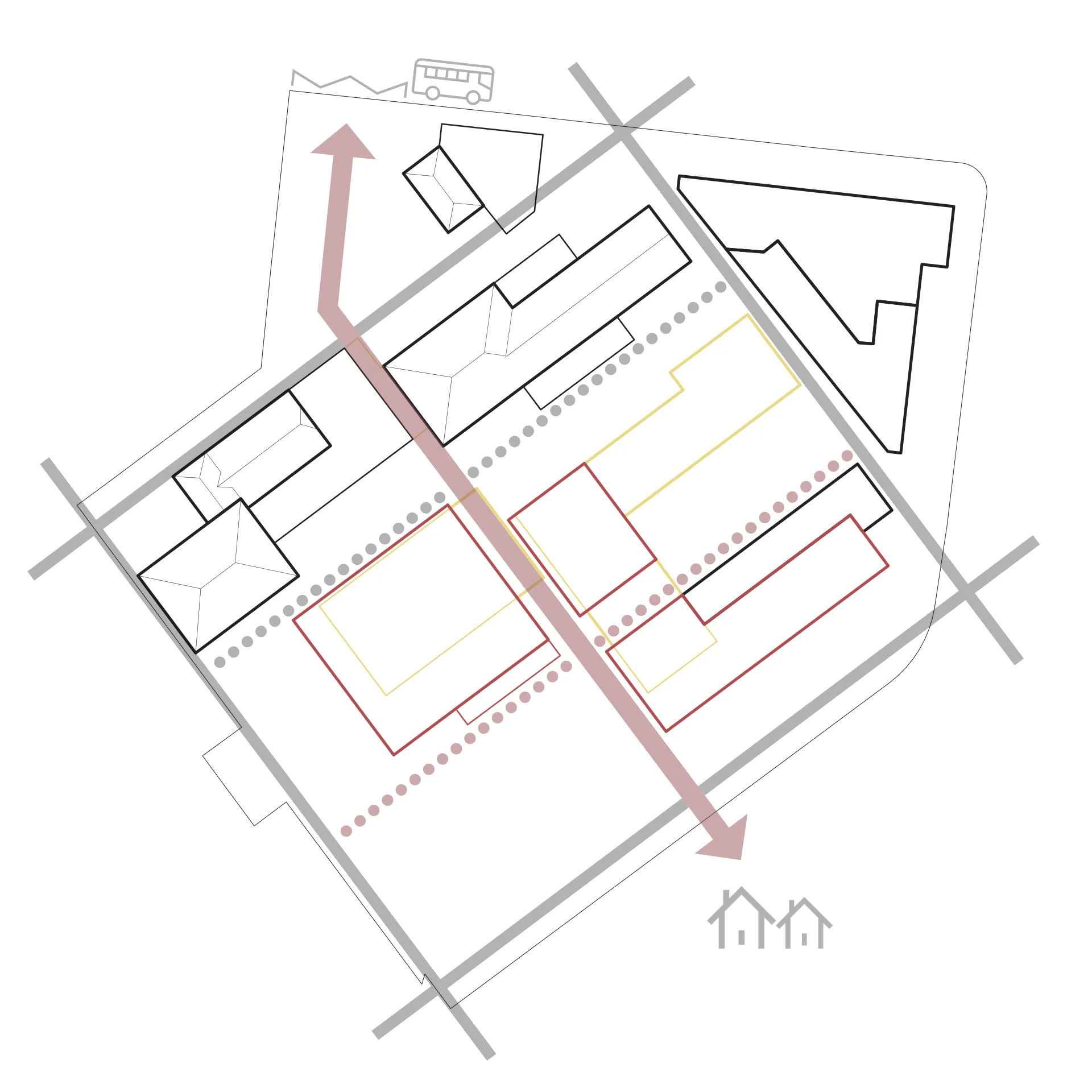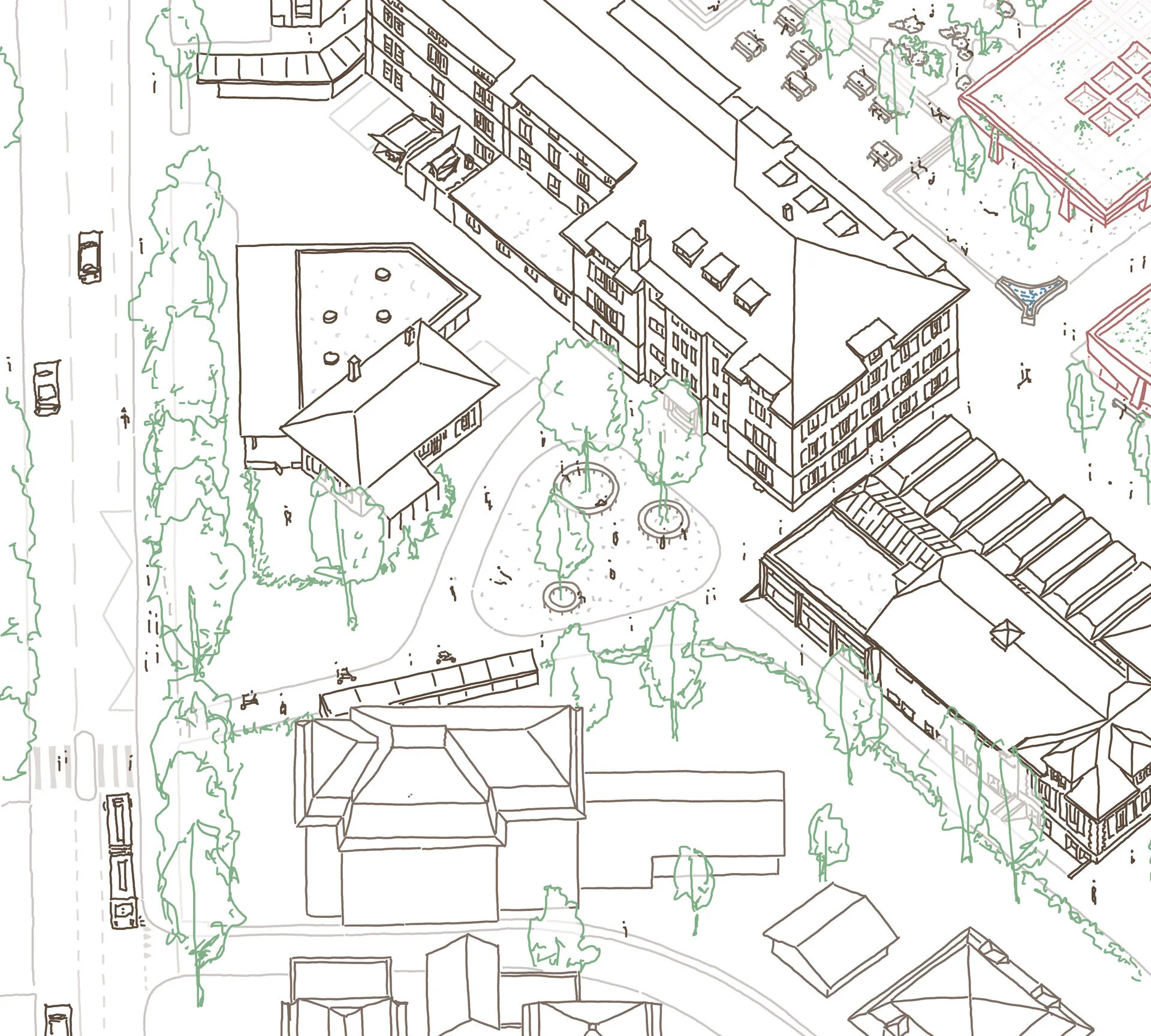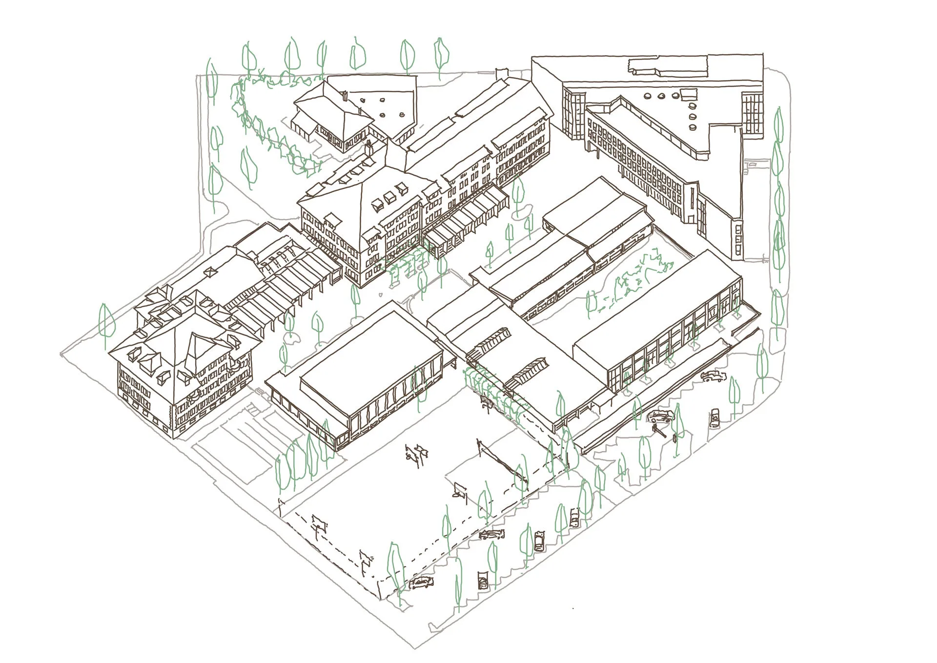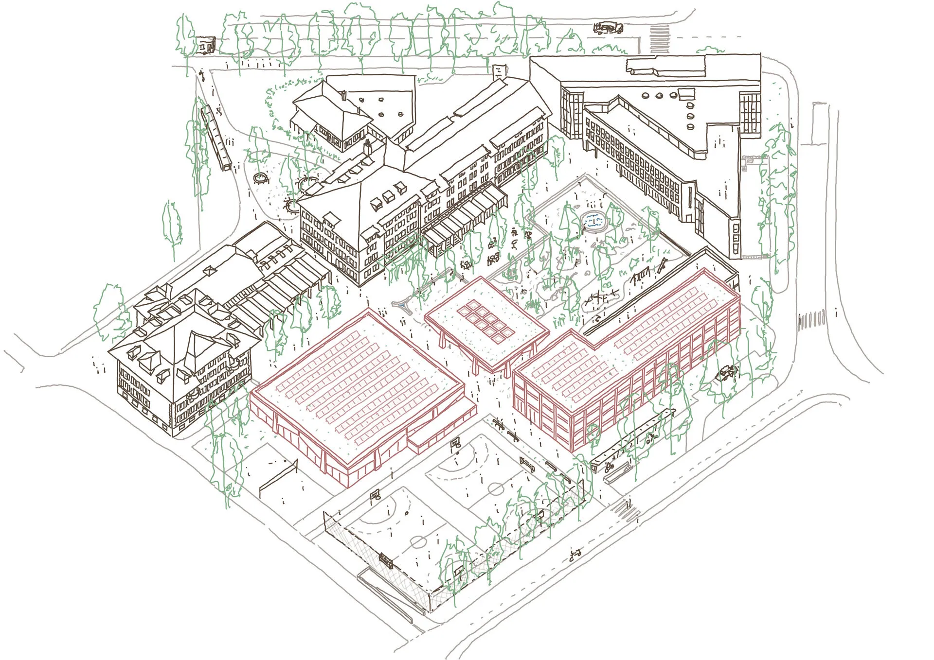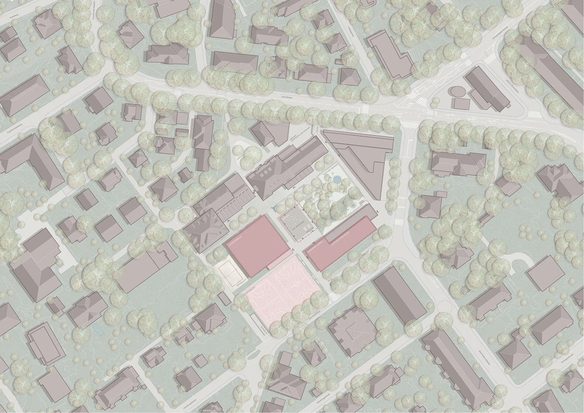 Mit wenigen gezielten Eingriffen wurde eine übergeordnete Wegführung in die vielfältige Anlage integriert und der Campus mit der Nachbarschaft vernetzt. Der neue Kopfbau im Süden und der frei zugängliche Sportplatz akzentuieren die neu gewonnene Zugänglichkeit. Der offene Pavillon im Zentrum des Campus spiegelt die pädagogische Haltung der Schule wider. Alle Lernenden sowie das Quartier werden unter einem Dach vereint.