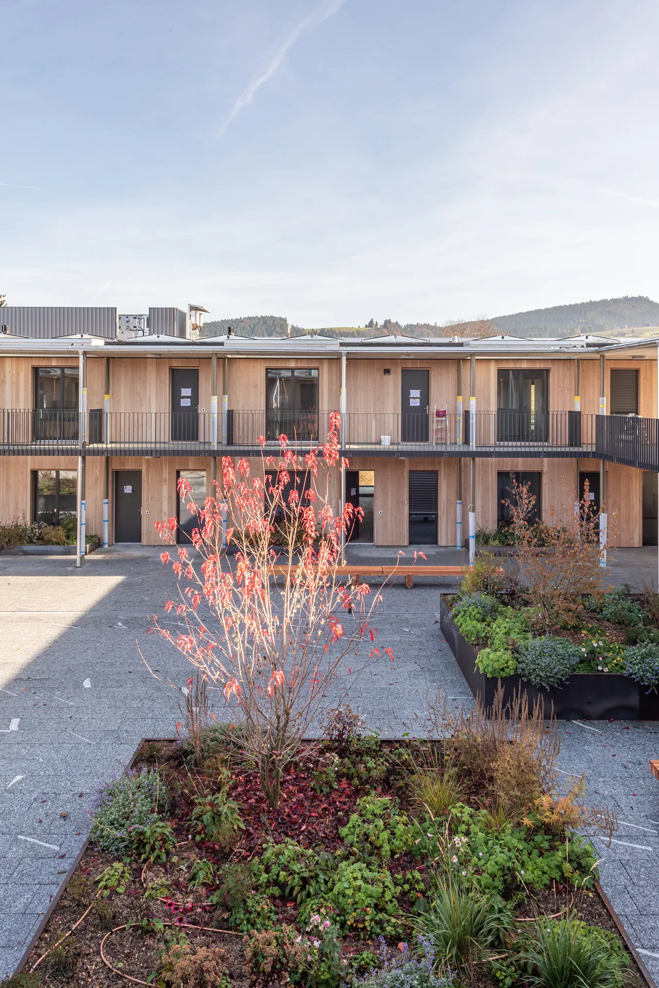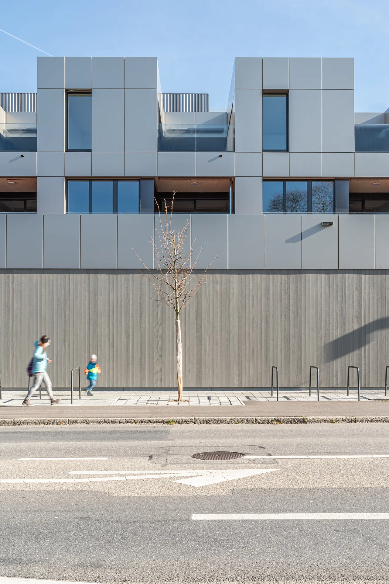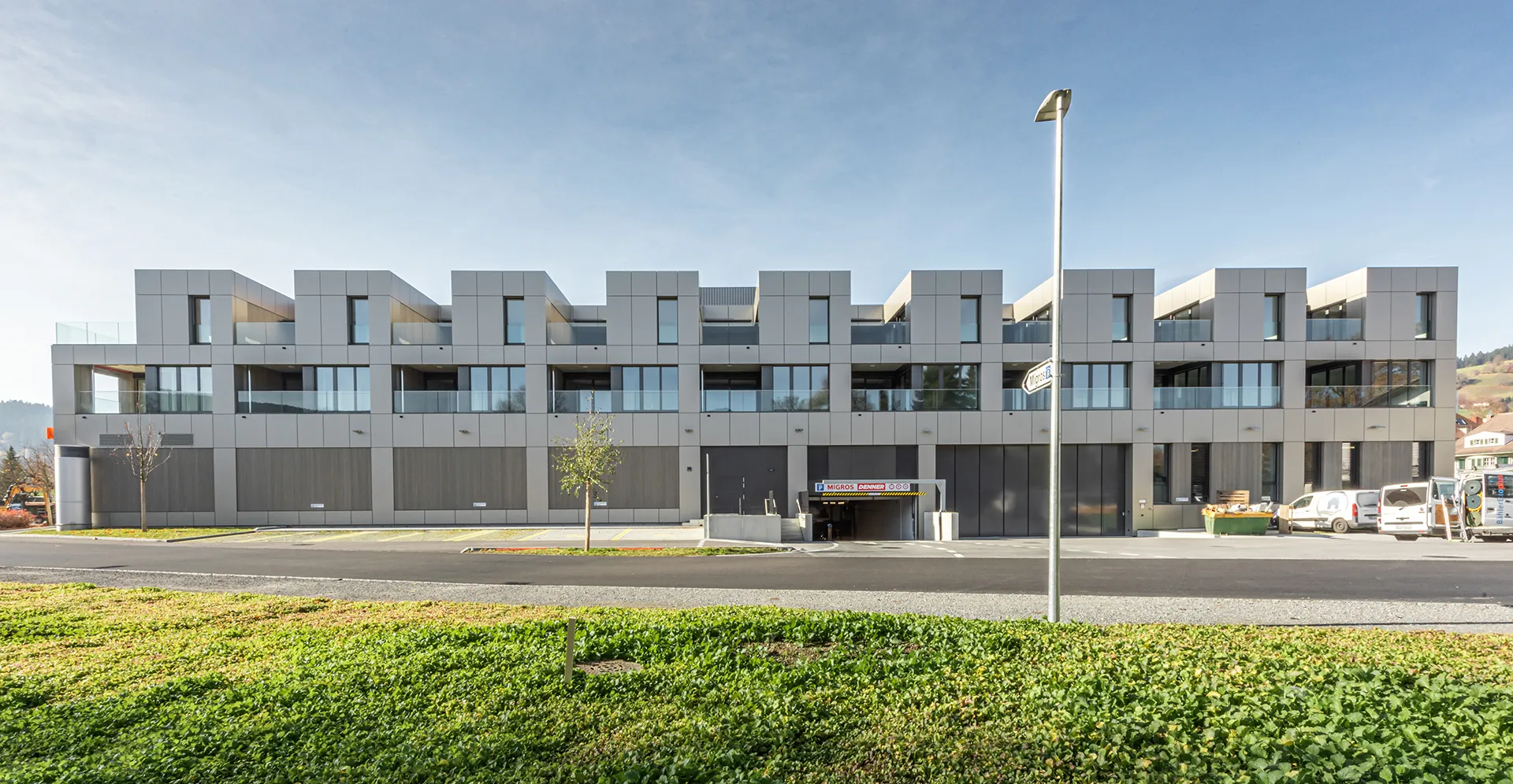 Der Neubau mit Ladengeschoss und Wohngeschoss mit Attika bildet mit seiner Volumetrie und Ausgestaltung einen neuen Ortseingang für Konolfingen. Die für den Ort typische Durchmischung von klein- und grossmassstäblichen Bauten wird aufgenommen. Der Baukörper wird gestalterisch und volumetrisch als Einheit ausgebildet.