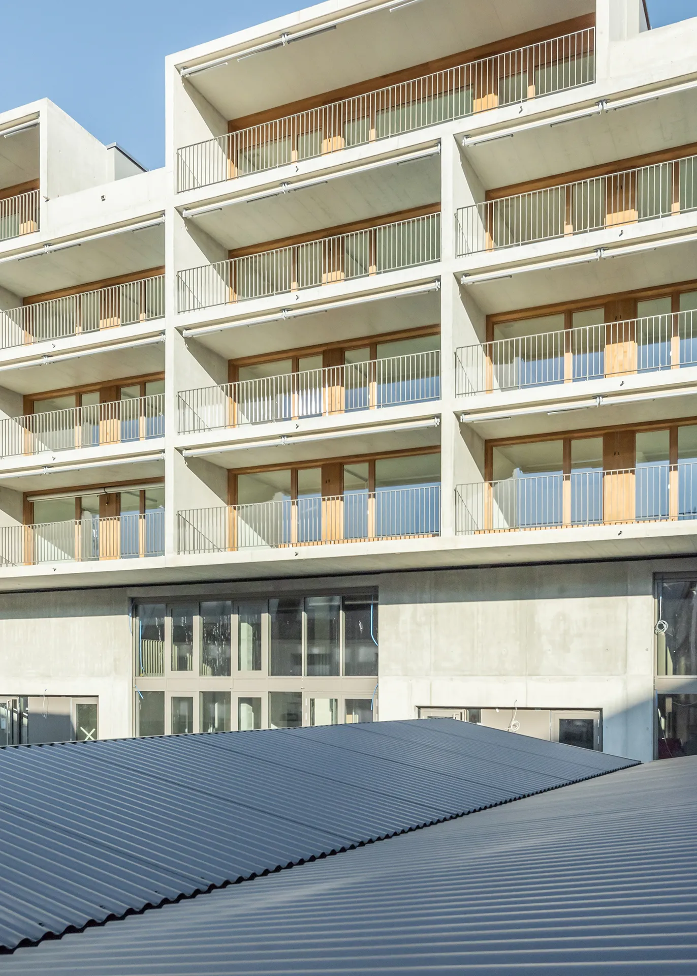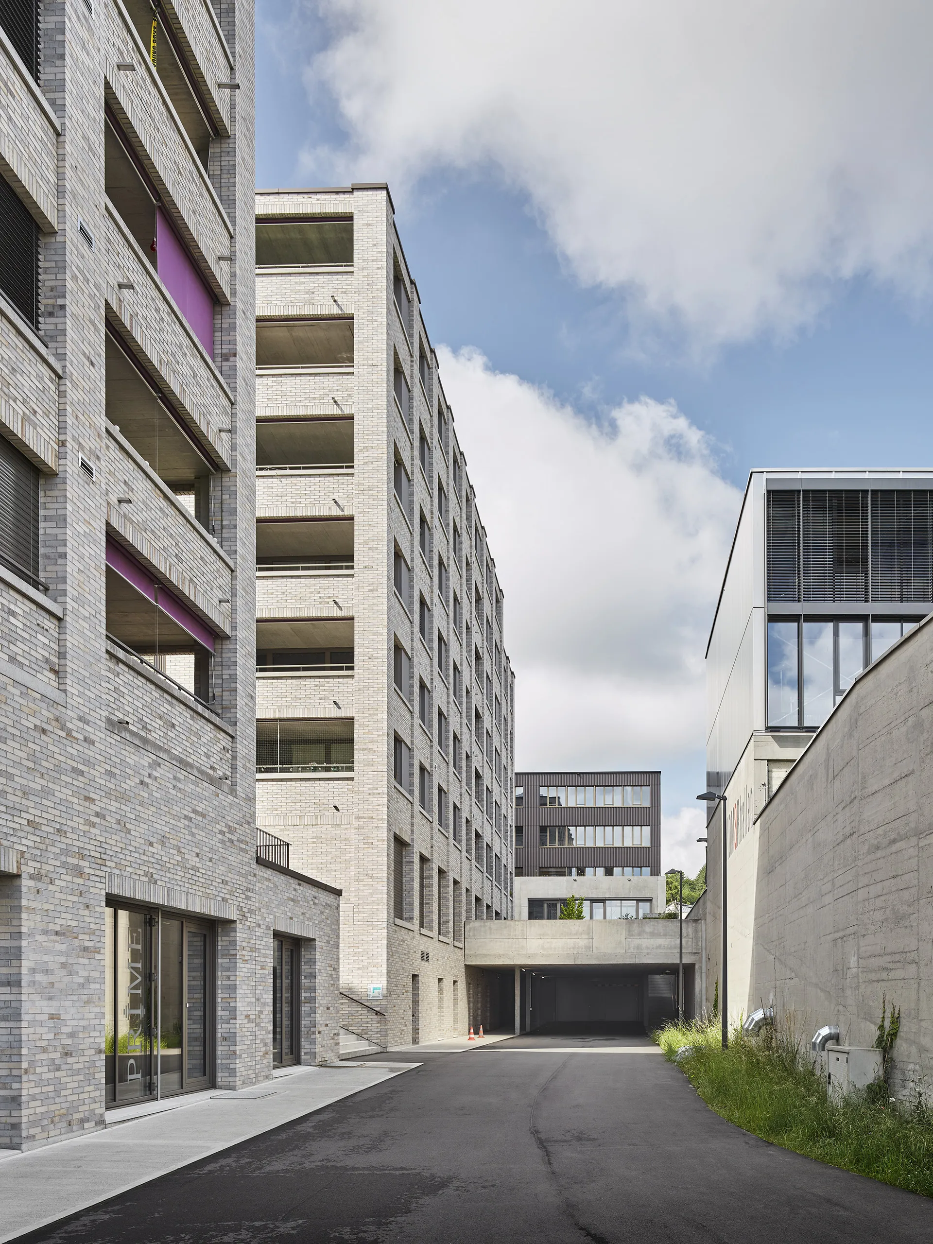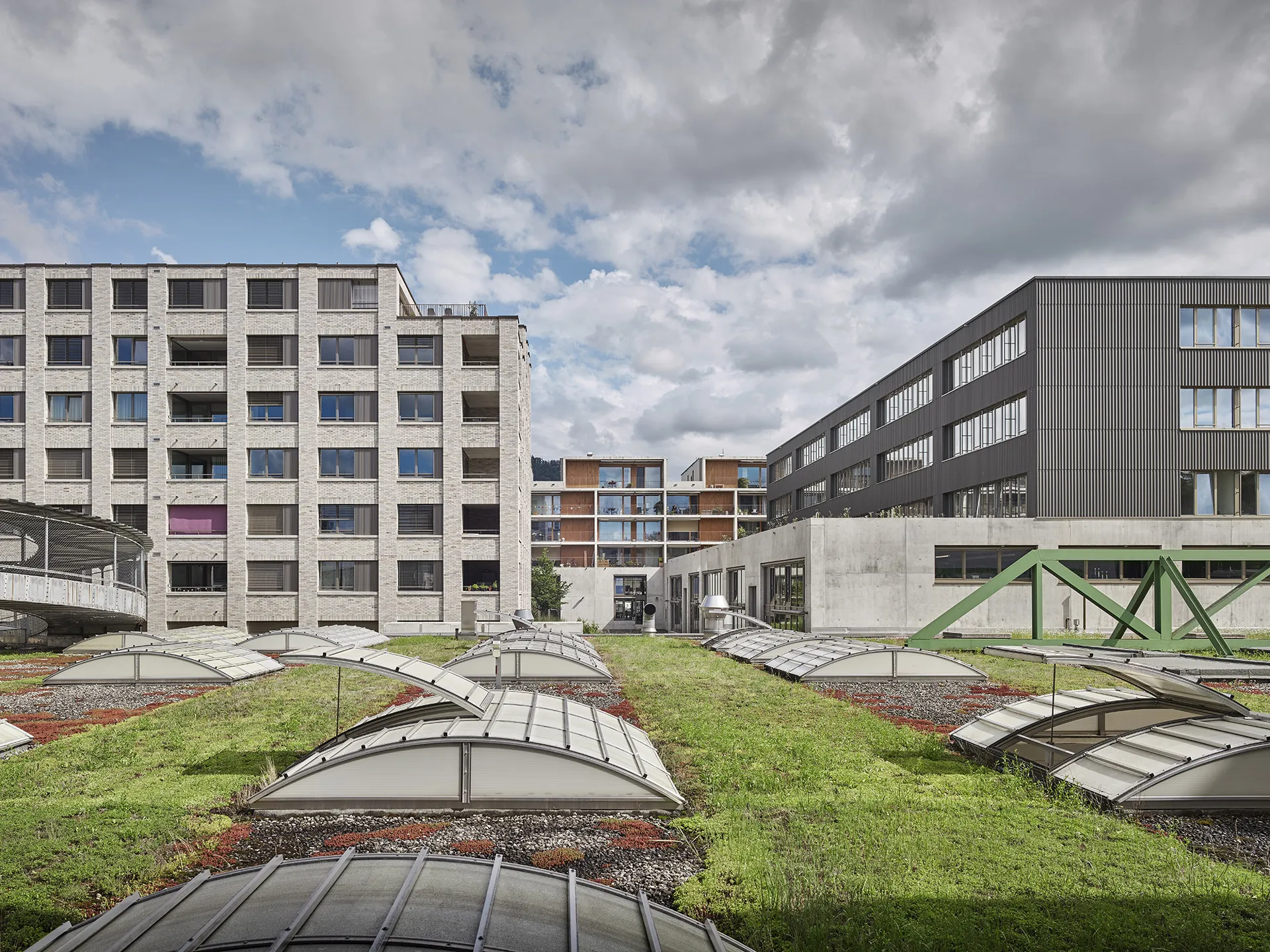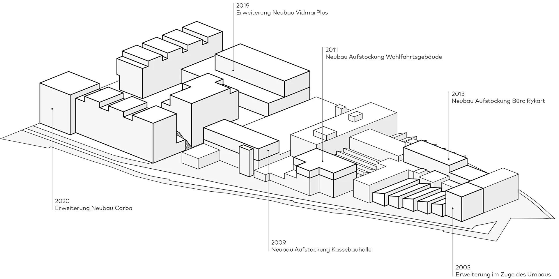 Die Volumetrie und Situierung der Baukörper entwickelt sich aus den Vidmarhallen. Vier Baukörper positionieren sich um einen zentralen Platz und verbinden die beiden gewachsenen Industrieareale, Carba und Vidmar, miteinander. Durch die zurückhaltende Materialisierung in Sichtbeton und Sichtmauerwerk erhalten die Neubauten einen eigenständigen Ausdruck und fügen sich harmonisch in die benachbarten Industrieareale Vidmar und Carba ein.