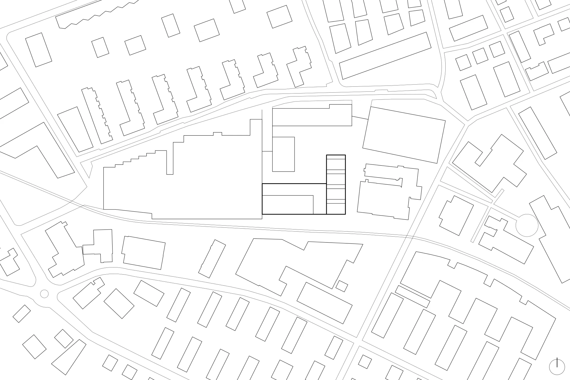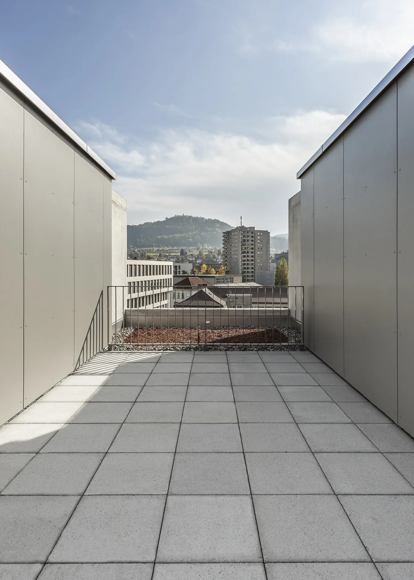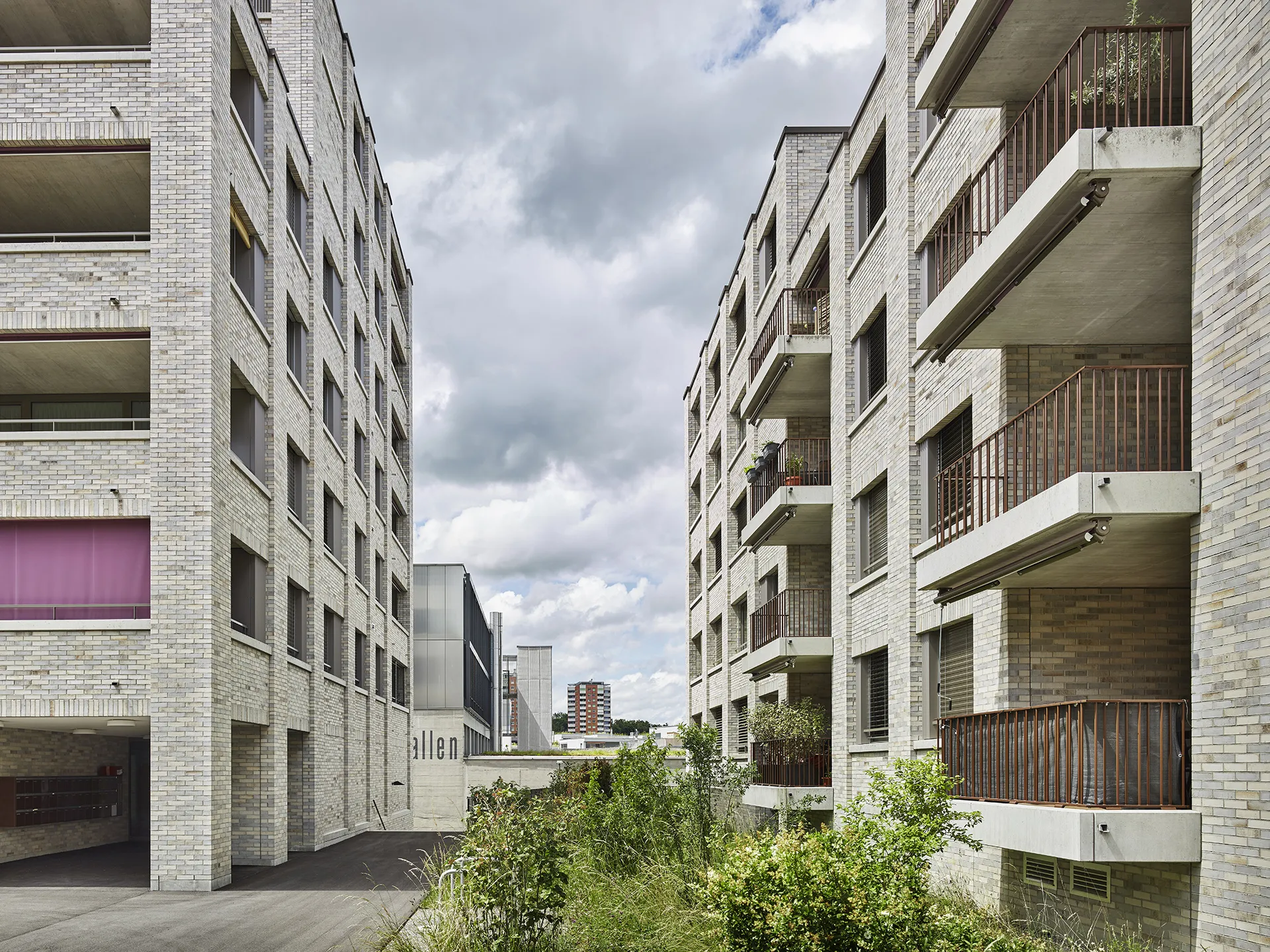 Die Volumetrie und Situierung der Baukörper entwickelt sich aus den Vidmarhallen. Vier Baukörper positionieren sich um einen zentralen Platz und verbinden die beiden gewachsenen Industrieareale, Carba und Vidmar, miteinander. Durch die zurückhaltende Materialisierung in Sichtbeton und Sichtmauerwerk erhalten die Neubauten einen eigenständigen Ausdruck und fügen sich harmonisch in die benachbarten Industrieareale Vidmar und Carba ein.