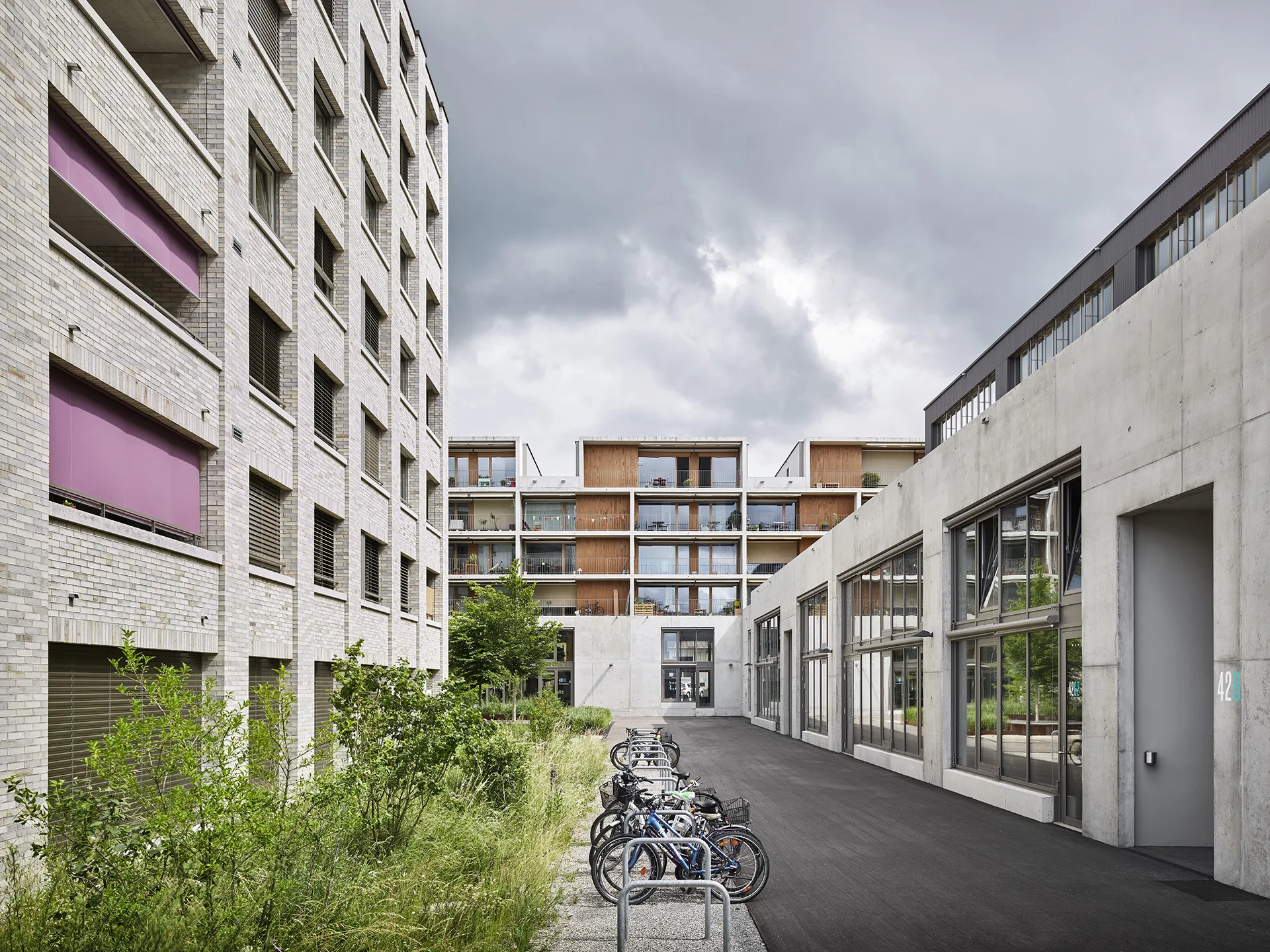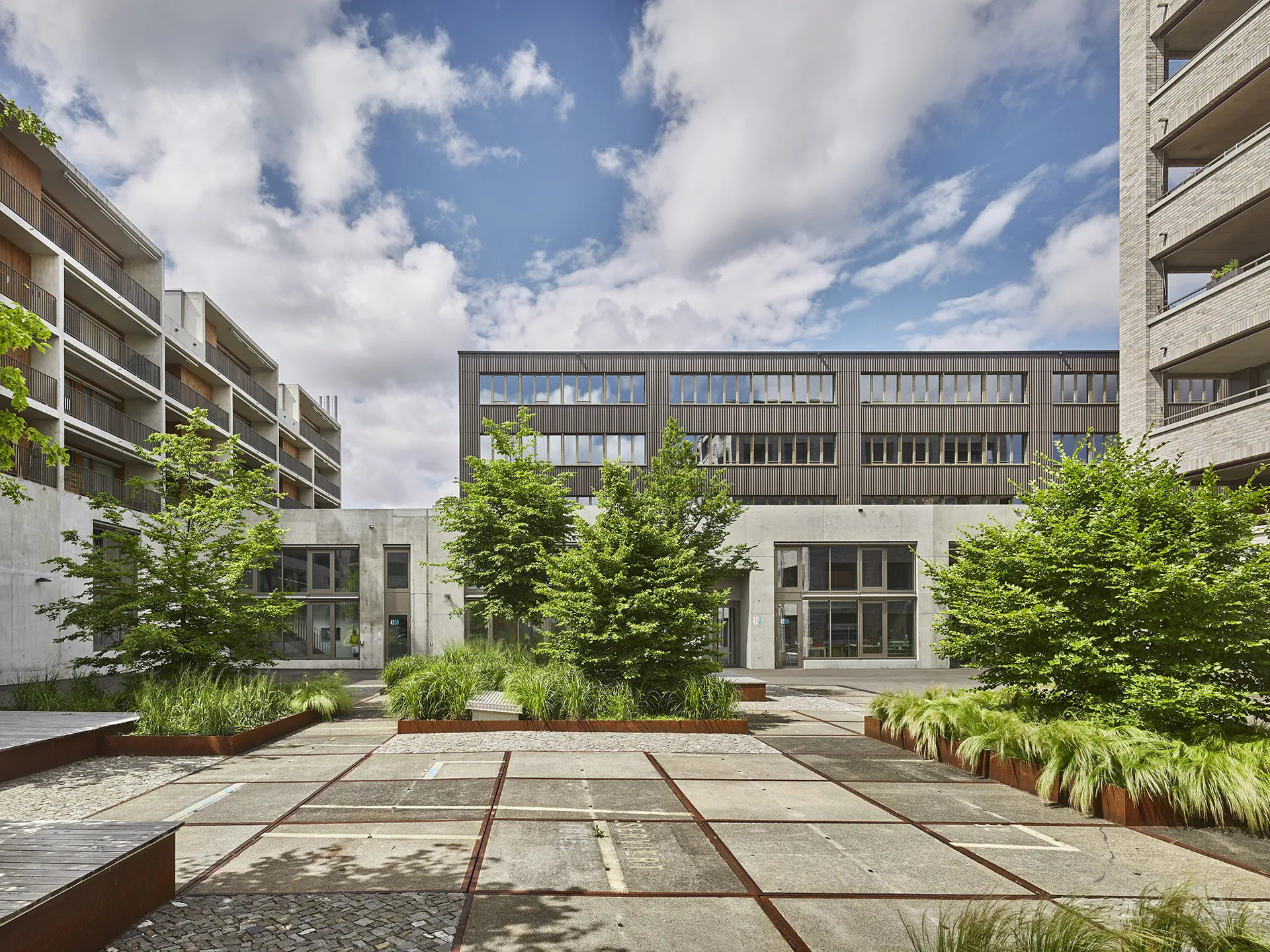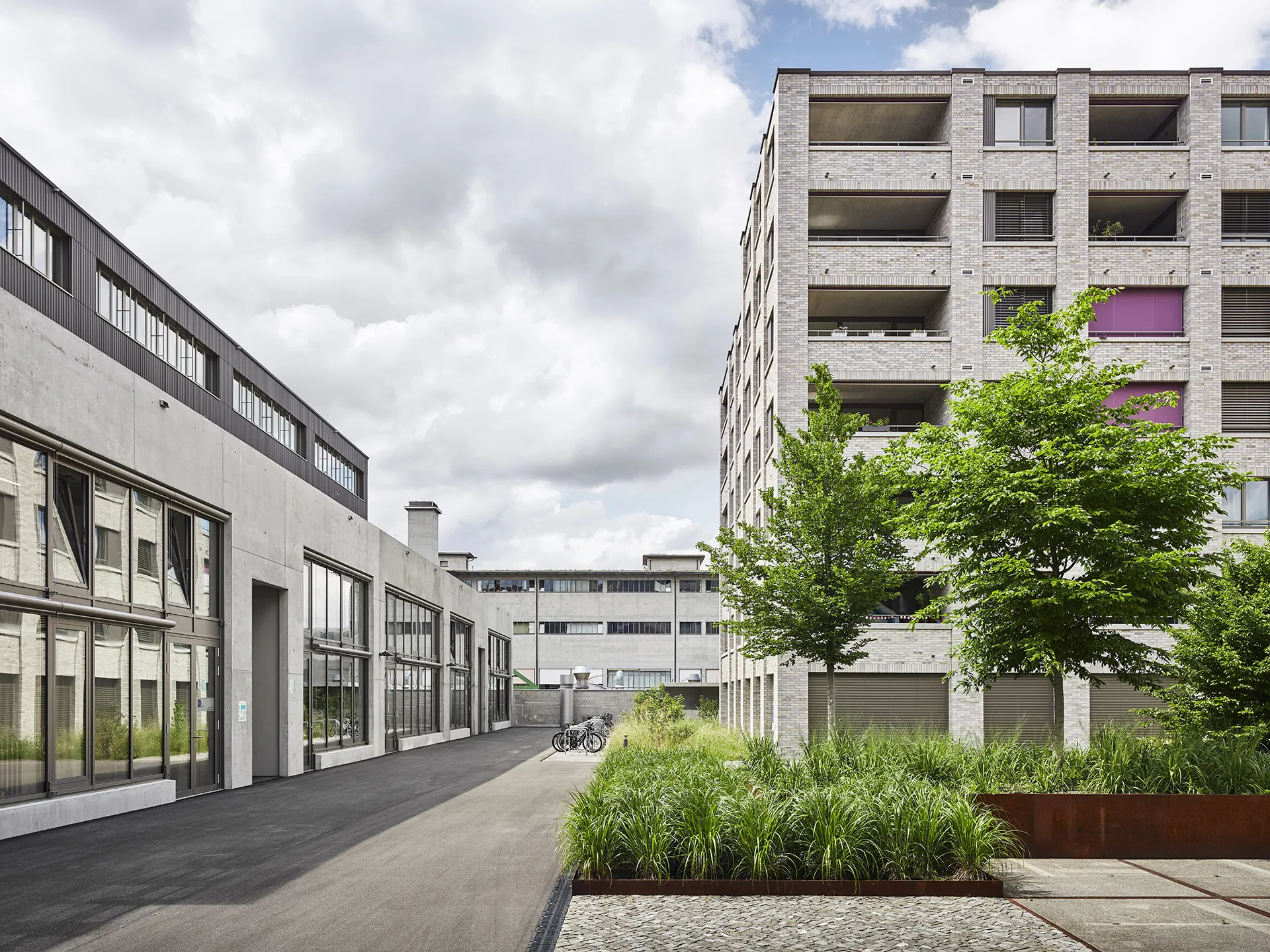 Die Mitte des Innenhofs wird mit hölzernen Sitzelementen und einem Baumdach als gemeinschaftlicher Aufenthaltsort ausgestaltet. Ausgezeichnet wird diese Insel mit grossformatigen Betonplatten, die aus der ursprünglichen Industrienutzung bewusst erhalten wurden.