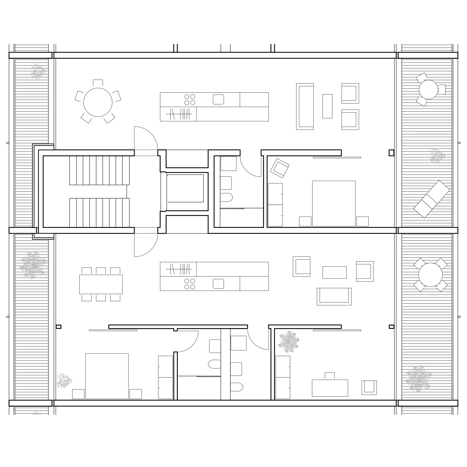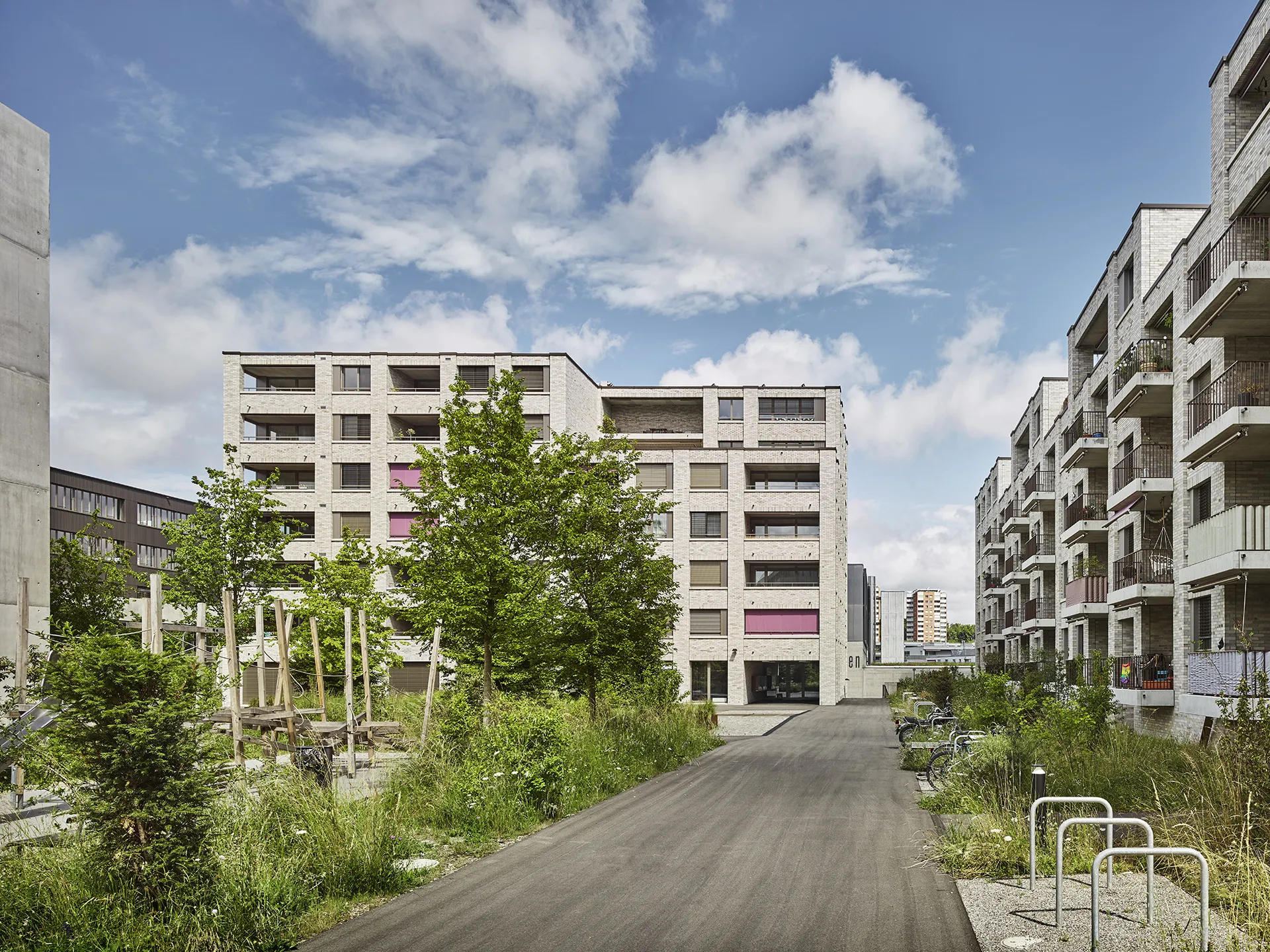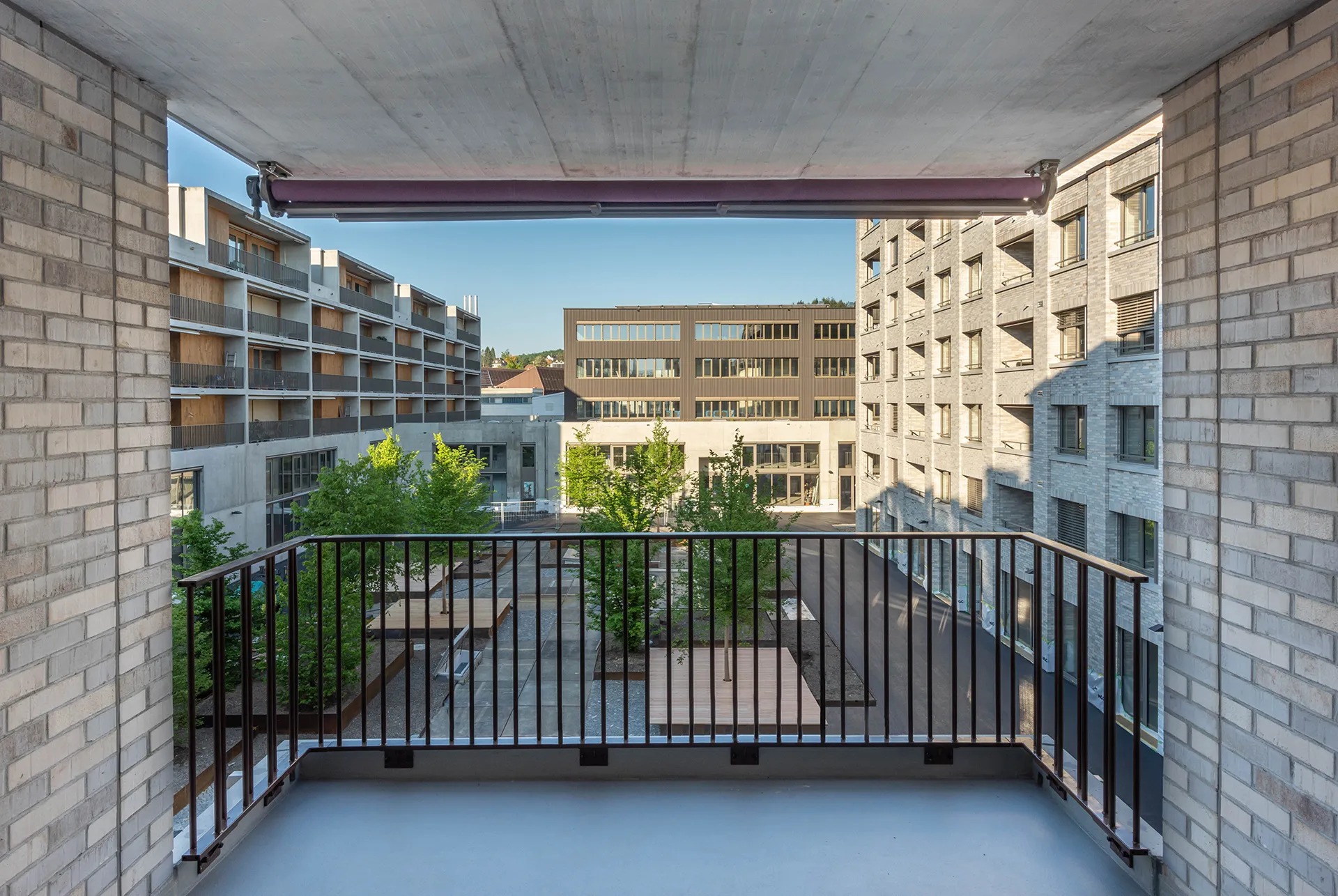 Die Mitte des Innenhofs wird mit hölzernen Sitzelementen und einem Baumdach als gemeinschaftlicher Aufenthaltsort ausgestaltet. Ausgezeichnet wird diese Insel mit grossformatigen Betonplatten, die aus der ursprünglichen Industrienutzung bewusst erhalten wurden.