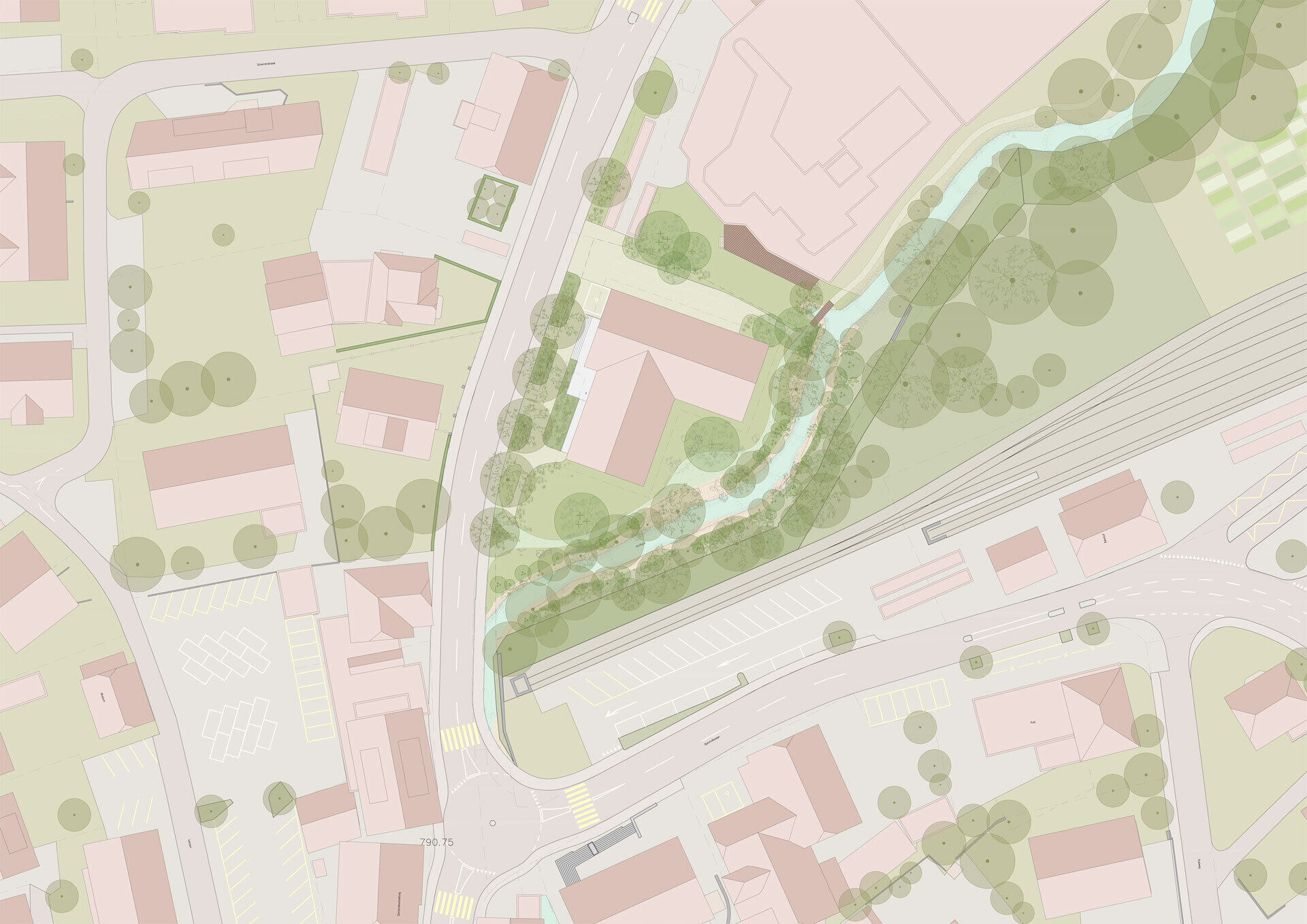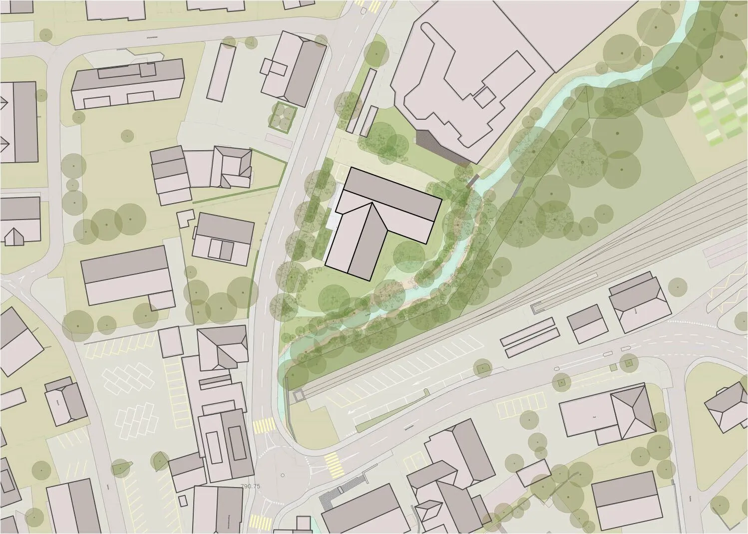 Die Freiraumgestaltung fördert die Aufenthaltsqualität für alle – mit Grünzonen, Sitzgelegenheiten und einer Verbindung zum Dorfbach, die zur Erholung einlädt. So entsteht ein Ort, der das soziale Leben in Schwarzenburg bereichert und stärkt.