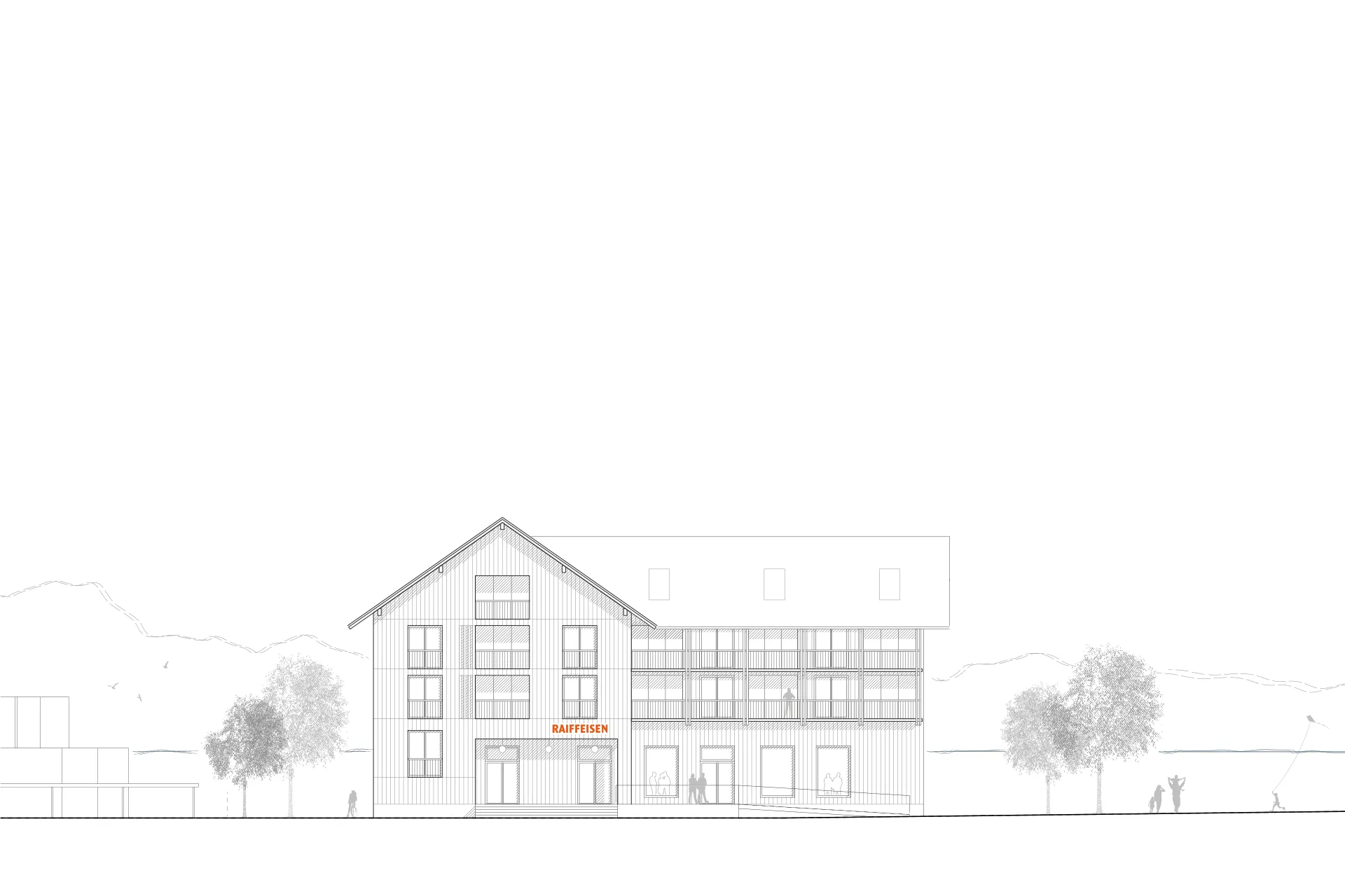 Im Erdgeschoss ist die neue Geschäftsstelle der Raiffeisenbank vorgesehen. Neben dem klassischen Bankbetrieb bietet sie Raum für Begegnung und Austausch: Ein öffentlich nutzbarer Multifunktionsraum ermöglicht Veranstaltungen, Informationsanlässe und kulturelle Aktivitäten. In den Obergeschossen entstehen zeitgemässe, gut belichtete Wohnungen, die das Nutzungsangebot im Dorfzentrum ergänzen und verdichten.