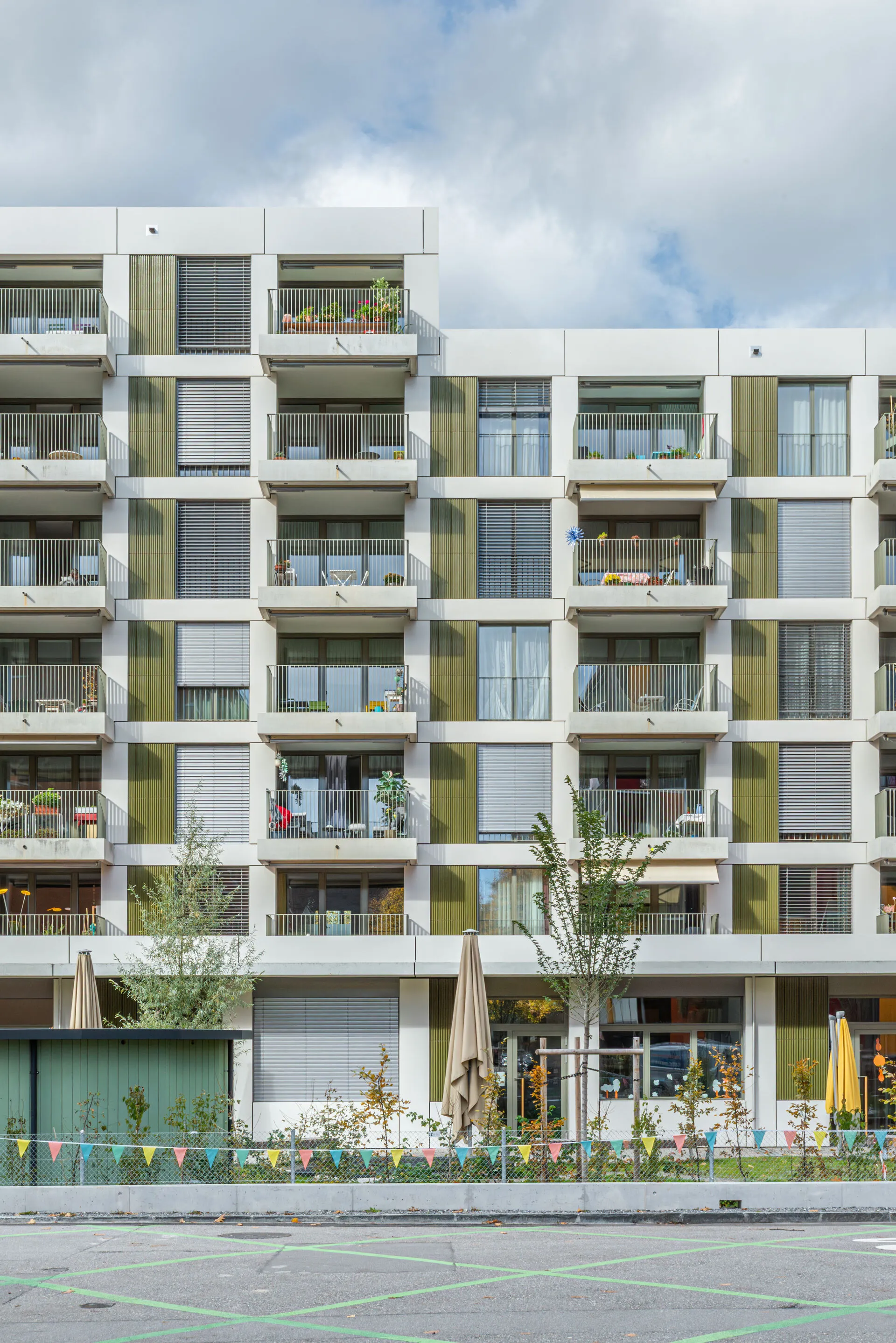 Im westlichen Perimeter wird das neue Pflegezentrum mit 112 Pflegeplätzen stationiert. Im östlichen Perimeter entstehen 34 Mietwohnungen für Menschen mit bescheidenem Einkommen. Das Erdgeschoss bietet Raum für soziale Nutzungen, wie das Quartierzentrum, die Kindertagesstätte und das öffentliche Restaurant des Pflegezentrums.