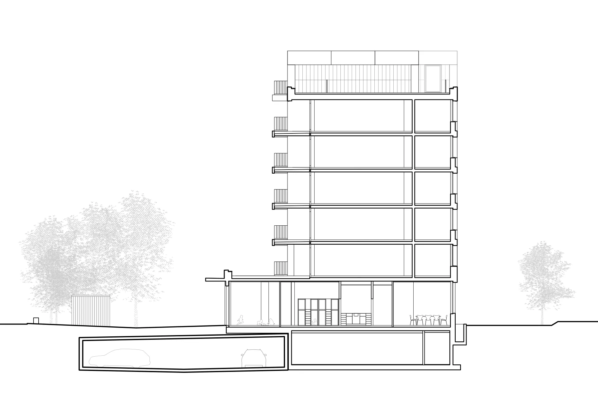 Im östlichen Gebäudeteil entstanden 34 gemeinnützige Mietwohnungen für Menschen mit bescheidenem Einkommen. Das Erdgeschoss beherbergt die städtische Kita und öffnet sich mit dem spielerischen Aussenraum zum Quartier.