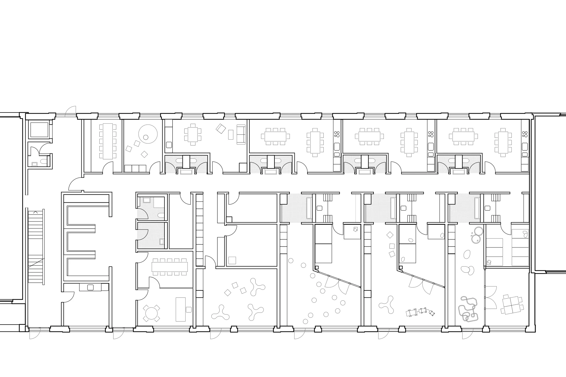 Die Kita ist klar strukturiert und gut auffindbar erschlossen. Sie umfasst drei Spielgruppen mit jeweils zugeordneten Nebenräumen und wird durch einen Gemeinschaftsraum, einen Bewegungsraum und einen Werkraum ergänzt. Eine interne Verbindung über das Treppenhaus ermöglicht den Bezug von Mahlzeiten aus dem Restaurant des Pflegezentrums. Mit ihrer abgestuften Volumetrie vermittelt die Kita zwischen den unterschiedlichen Nutzungen und trägt wesentlich zu einer familienfreundlichen Quartierentwicklung bei.