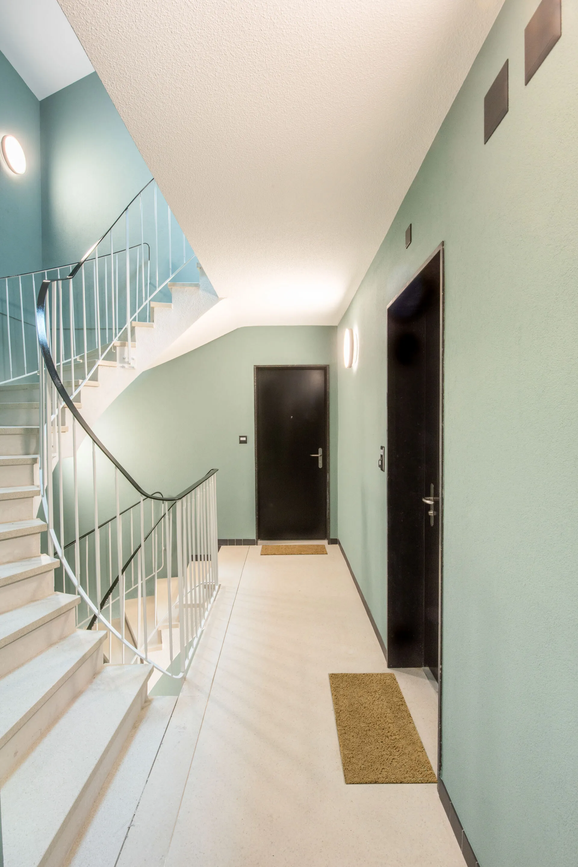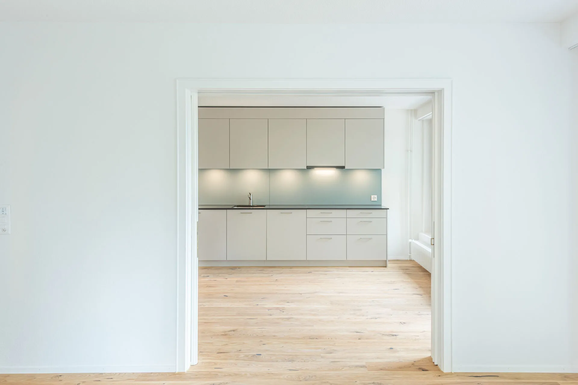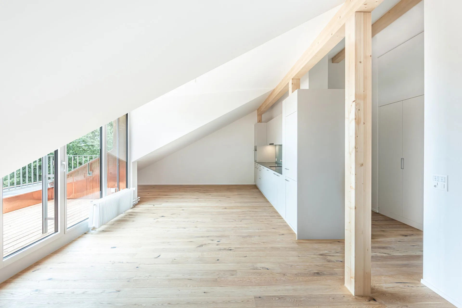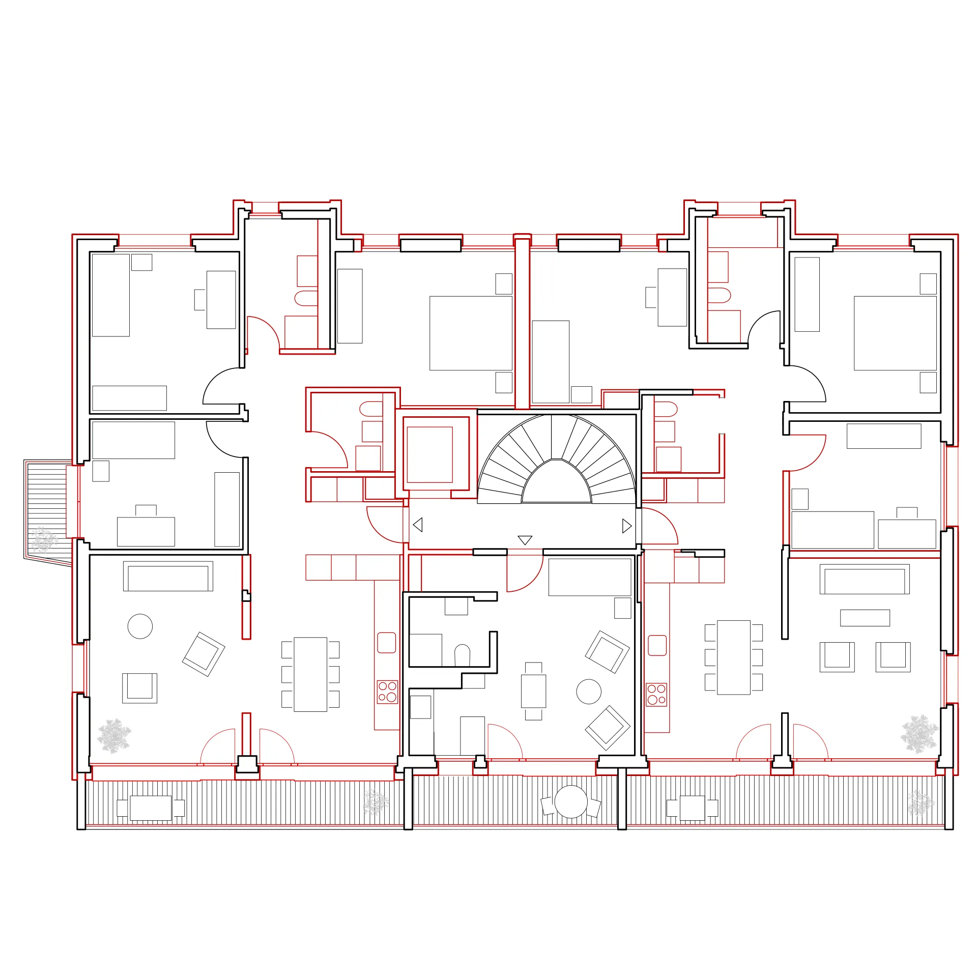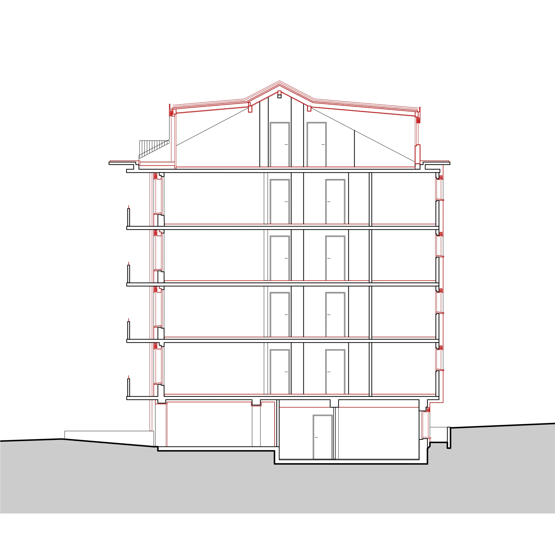 Der murale Charakter der symmetrisch aufgebauten Fassade soll erhalten bleiben. Eine kompakte Aussenwärmedämmung mit einem hochwertigen mineralischen Verputz lässt das Gebäude weiterhin ruhig wirken. Die gleichbleibenden Fenster- und Balkonschichten bilden den gewünschten kompakten Gebäudecharakter. Das Dachgeschoss wird ausgebaut. Eine Erhöhung, respektive Aufstockung des Gebäudes wird nicht angestrebt. Die bestehenden Proportionen wirken ausgewogen und sollen erhalten und mit geringen Eingriffen ergänzt werden.