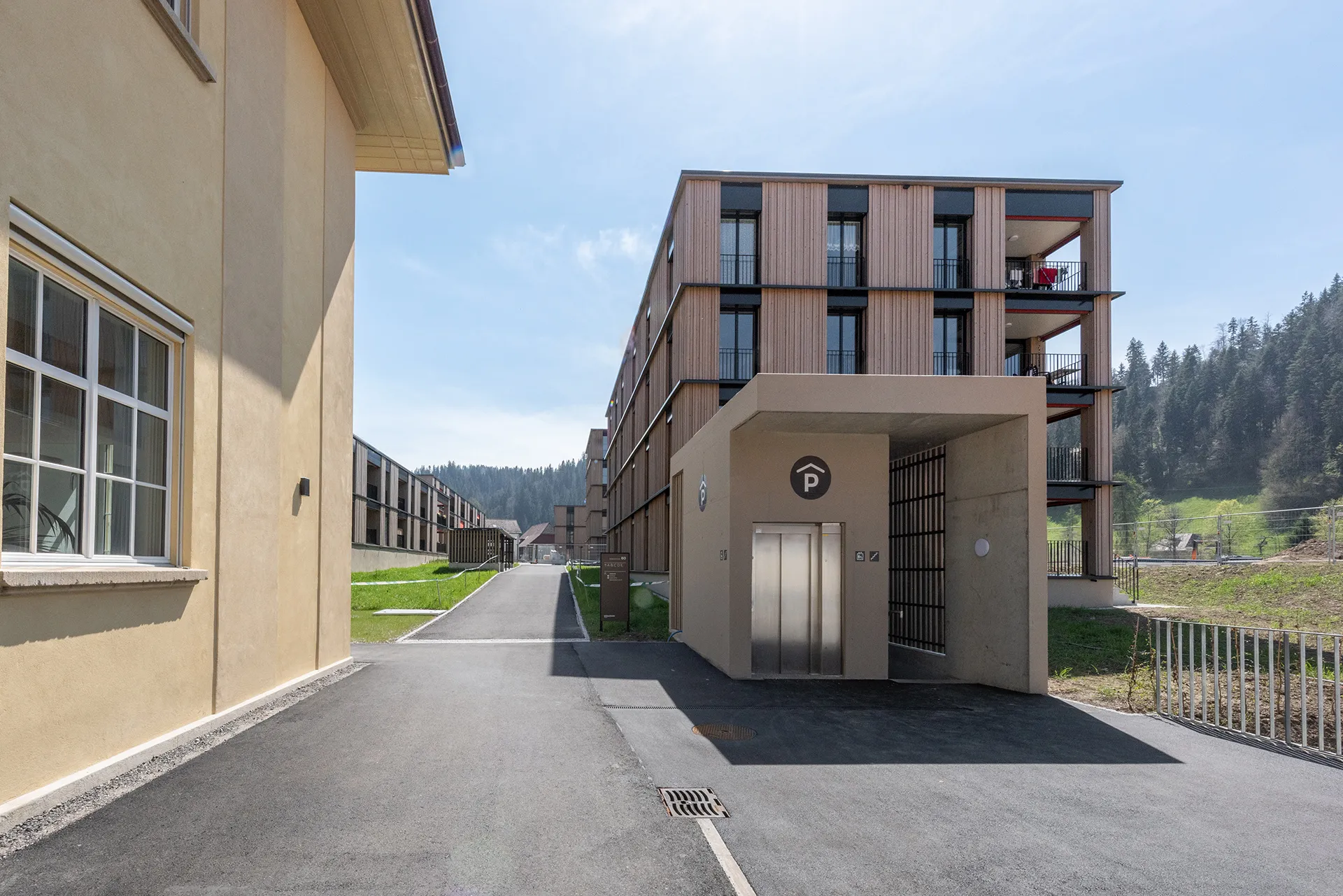 Das Planungsgebiet befindet sich am Ortsrand von Bärau in einer Senke zwischen der Bäraustrasse und den Bahngleisen. Das angrenzende Gebäudeensemble der ehemaligen Lauterburg-Fabrik prägt den Ort und hat einen hohen Identifikationswert. Insbesondere die alte Zettlerei ist aus dem Strassenraum stark spürbar. Die neue Überbauung an der Bäraustrasse wird präzise in diese sensible Nachbarschaft eingepasst. Zwei Wohnzeilen bilden den Auftakt und somit auch eine adäquate Adresse für das neue Quartier. Das städtebauliche Muster, bestehend aus drei unterschiedlichen Baukörpern, ist in der Höhe von 3 bis 5 Geschossen gestuft. Die versetzte Anordnung der Gebäude ermöglicht spannende Durchblicke und Durchwegungen und eröffnet den Bewohnern Ausblicke in die umliegende Landschaft. Die Baukörper werden durch Höfe zu Baugruppen zusammengebunden. Diese lehnen sich an die regional typischen Baugruppen der landwirtschaftlichen Gehöfte an und schaffen für deren Bewohner Identität und Massstäblichkeit. Die gesamte Siedlung wird durch das sorgfältige Einbetten in die Landschaft hindernisfrei gestaltet.